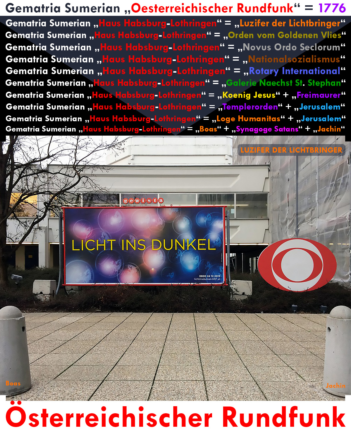![]() ![]() ![]() ![]() ORF-ENTERPRISE GMBH + ORF-ENTERPRISE GMBH UND CO KG + OESTERREICHISCHER RUNDFUNK = JESUITEN + GROSSLOGE VON OESTERREICH DER ALTEN, FREIEN UND ANGENOMMENEN MAURER Gematria Sumerian "ORF-Enterprise GmbH + ORF-Enterprise GmbH und Co KG + Oesterreichischer Rundfunk" = "Jesuiten" + "Grossloge von Oesterreich der Alten, Freien und Angenommenen Maurer" PANEUROPA-UNION + ORF-ENTERPRISE GMBH + ORF-ENTERPRISE GMBH UND CO KG + OESTERREICHISCHER RUNDFUNK = = WEISHEIT, STAERKE, SCHOENHEIT + GROSSLOGE VON OESTERREICH DER ALTEN, FREIEN UND ANGENOMMENEN MAURER Gematria Sumerian "Paneuropa-Union + ORF-Enterprise GmbH + ORF-Enterprise GmbH und Co KG + Oesterreichischer Rundfunk" = = "Weisheit, Staerke, Schoenheit" + "Grossloge von Oesterreich der Alten, Freien und Angenommenen Maurer" G ---> "G. 0. D." (die Anfangsbuchstaben für die hebräischen Wörter für Weisheit, Stärke und Schönheit, die 3 Leitgedanken der Freimaurerei = Wisdom, Strength, Beauty) ![]() ILLUMINATI + REPUBLIK OESTERREICH + ORF-ENTERPRISE GMBH + ORF-ENTERPRISE GMBH UND CO KG + OESTERREICHISCHER RUNDFUNK = JESUS VON NAZARETH + 1776 + 1776 + 1776 ILLUMINATI + REPUBLIK OESTERREICH + ORF-ENTERPRISE GMBH + ORF-ENTERPRISE GMBH UND CO KG + OESTERREICHISCHER RUNDFUNK = JESUS VON NAZARETH + 12 x JESUS ILLUMINATI + REPUBLIK OESTERREICH + ORF-ENTERPRISE GMBH + ORF-ENTERPRISE GMBH UND CO KG + OESTERREICHISCHER RUNDFUNK = JESUS VON NAZARETH + symbolisch die 12 Apostel x JESUS ILLUMINATI + REPUBLIK OESTERREICH + ORF-ENTERPRISE GMBH + ORF-ENTERPRISE GMBH UND CO KG + OESTERREICHISCHER RUNDFUNK = JESUS VON NAZARETH + symbolisch die 12 Stämme Israels x JESUS ILLUMINATI + REPUBLIK OESTERREICH + ORF-ENTERPRISE GMBH + ORF-ENTERPRISE GMBH UND CO KG + OESTERREICHISCHER RUNDFUNK = JESUS VON NAZARETH + SATAN + 1666 + 1666 + 1666 Gematria Sumerian "Illuminati + Republik Oesterreich + ORF-Enterprise GmbH + ORF-Enterprise GmbH und Co KG + Oesterreichischer Rundfunk" = "Jesus von Nazareth" + 1776 + 1776 + 1776 Gematria Sumerian "Illuminati + Republik Oesterreich + ORF-Enterprise GmbH + ORF-Enterprise GmbH und Co KG + Oesterreichischer Rundfunk" = "Jesus von Nazareth" + 12 x "Jesus" Gematria Sumerian "Illuminati + Republik Oesterreich + ORF-Enterprise GmbH + ORF-Enterprise GmbH und Co KG + Oesterreichischer Rundfunk" = "Jesus von Nazareth" + symbolisch die 12 Apostel x "Jesus" Gematria Sumerian "Illuminati + Republik Oesterreich + ORF-Enterprise GmbH + ORF-Enterprise GmbH und Co KG + Oesterreichischer Rundfunk" = "Jesus von Nazareth" + symbolisch die 12 Stämme Israels x "Jesus" Gematria Sumerian "Illuminati + Republik Oesterreich + ORF-Enterprise GmbH + ORF-Enterprise GmbH und Co KG + Oesterreichischer Rundfunk" = "Jesus von Nazareth" + "Satan" + 1666 + 1666 + 1666 VEREINIGTE GROSSLOGE VON ENGLAND + ORF-ENTERPRISE GMBH + ORF-ENTERPRISE GMBH UND CO KG + OESTERREICHISCHER RUNDFUNK = JESUS VON NAZARETH + 1776 + 1776 + 1776 VEREINIGTE GROSSLOGE VON ENGLAND + ORF-ENTERPRISE GMBH + ORF-ENTERPRISE GMBH UND CO KG + OESTERREICHISCHER RUNDFUNK = JESUS VON NAZARETH + 12 x JESUS VEREINIGTE GROSSLOGE VON ENGLAND + ORF-ENTERPRISE GMBH + ORF-ENTERPRISE GMBH UND CO KG + OESTERREICHISCHER RUNDFUNK = JESUS VON NAZARETH + symbolisch die 12 Apostel x JESUS VEREINIGTE GROSSLOGE VON ENGLAND + ORF-ENTERPRISE GMBH + ORF-ENTERPRISE GMBH UND CO KG + OESTERREICHISCHER RUNDFUNK = JESUS VON NAZARETH + symbolisch die 12 Stämme Israels x JESUS VEREINIGTE GROSSLOGE VON ENGLAND + ORF-ENTERPRISE GMBH + ORF-ENTERPRISE GMBH UND CO KG + OESTERREICHISCHER RUNDFUNK = JESUS VON NAZARETH + SATAN + 1666 + 1666 + 1666 Gematria Sumerian "Vereinigte Grossloge von England + ORF-Enterprise GmbH + ORF-Enterprise GmbH und Co KG + Oesterreichischer Rundfunk" = "Jesus von Nazareth" + 1776 + 1776 + 1776 Gematria Sumerian "Vereinigte Grossloge von England + ORF-Enterprise GmbH + ORF-Enterprise GmbH und Co KG + Oesterreichischer Rundfunk" = "Jesus von Nazareth" + 12 x "Jesus" Gematria Sumerian "Vereinigte Grossloge von England + ORF-Enterprise GmbH + ORF-Enterprise GmbH und Co KG + Oesterreichischer Rundfunk" = "Jesus von Nazareth" + symbolisch die 12 Apostel x "Jesus" Gematria Sumerian "Vereinigte Grossloge von England + ORF-Enterprise GmbH + ORF-Enterprise GmbH und Co KG + Oesterreichischer Rundfunk" = "Jesus von Nazareth" + symbolisch die 12 Stämme Israels x "Jesus" Gematria Sumerian "Vereinigte Grossloge von England + ORF-Enterprise GmbH + ORF-Enterprise GmbH und Co KG + Oesterreichischer Rundfunk" = "Jesus von Nazareth" + "Satan" + 1666 + 1666 + 1666 ANTICHRIST + ORF-ENTERPRISE GMBH + ORF-ENTERPRISE GMBH UND CO KG + OESTERREICHISCHER RUNDFUNK = 1776 + 1776 + 1776 ANTICHRIST + ORF-ENTERPRISE GMBH + ORF-ENTERPRISE GMBH UND CO KG + OESTERREICHISCHER RUNDFUNK = 12 x JESUS ANTICHRIST + ORF-ENTERPRISE GMBH + ORF-ENTERPRISE GMBH UND CO KG + OESTERREICHISCHER RUNDFUNK = symbolisch die 12 Apostel x JESUS ANTICHRIST + ORF-ENTERPRISE GMBH + ORF-ENTERPRISE GMBH UND CO KG + OESTERREICHISCHER RUNDFUNK = symbolisch die 12 Stämme Israels x JESUS ANTICHRIST + ORF-ENTERPRISE GMBH + ORF-ENTERPRISE GMBH UND CO KG + OESTERREICHISCHER RUNDFUNK = SATAN + 1666 + 1666 + 1666 Gematria Sumerian "Antichrist + ORF-Enterprise GmbH + ORF-Enterprise GmbH und Co KG + Oesterreichischer Rundfunk" = 1776 + 1776 + 1776 Gematria Sumerian "Antichrist + ORF-Enterprise GmbH + ORF-Enterprise GmbH und Co KG + Oesterreichischer Rundfunk" = 12 x "Jesus" Gematria Sumerian "Antichrist + ORF-Enterprise GmbH + ORF-Enterprise GmbH und Co KG + Oesterreichischer Rundfunk" = symbolisch die 12 Apostel x "Jesus" Gematria Sumerian "Antichrist + ORF-Enterprise GmbH + ORF-Enterprise GmbH und Co KG + Oesterreichischer Rundfunk" = symbolisch die 12 Stämme Israels x "Jesus" Gematria Sumerian "Antichrist + ORF-Enterprise GmbH + ORF-Enterprise GmbH und Co KG + Oesterreichischer Rundfunk" = "Satan" + 1666 + 1666 + 1666 ORF-ENTERPRISE GMBH + ORF-ENTERPRISE GMBH UND CO KG = ERZDIOEZESE WIEN + WEISHEIT, STAERKE, SCHOENHEIT ORF-ENTERPRISE GMBH + O