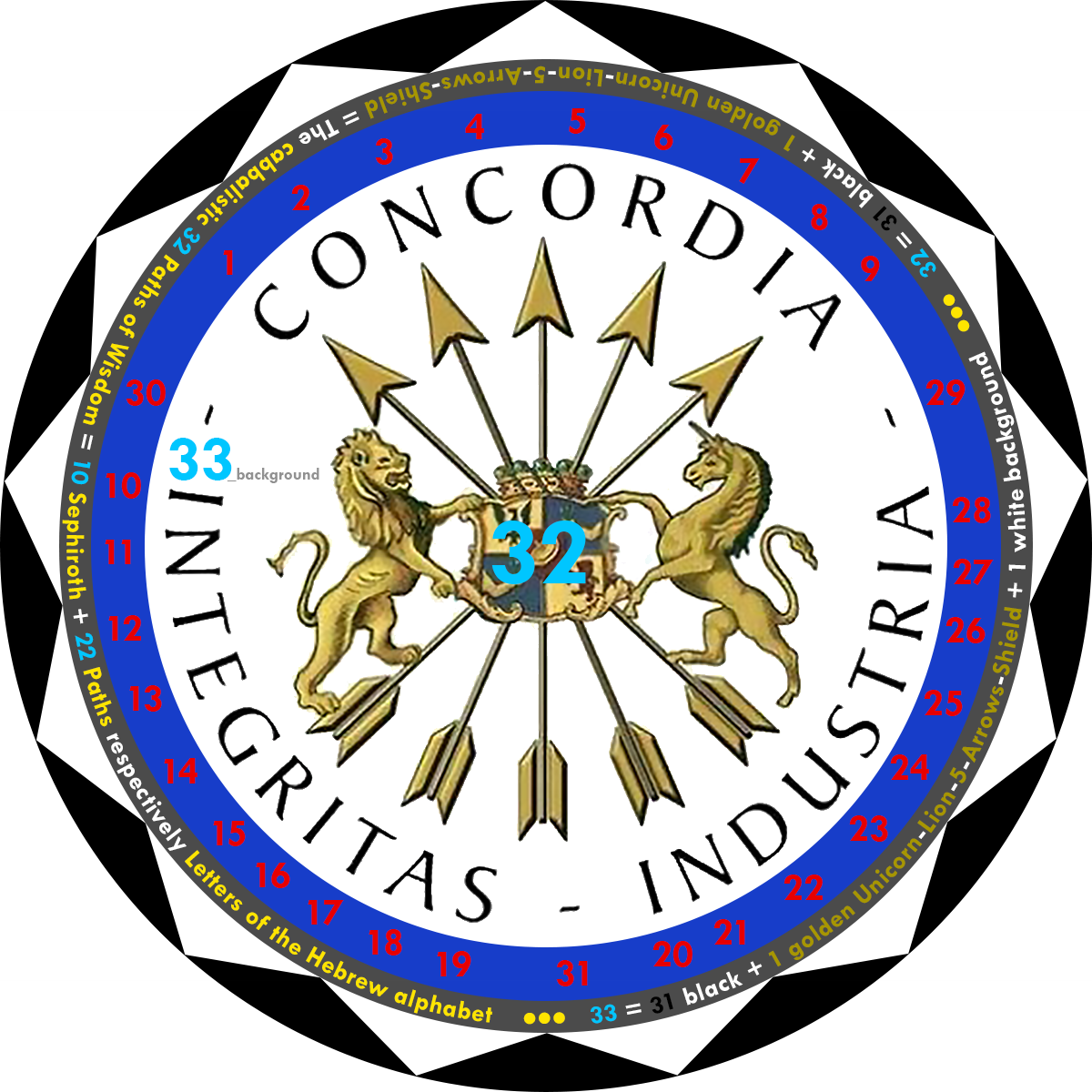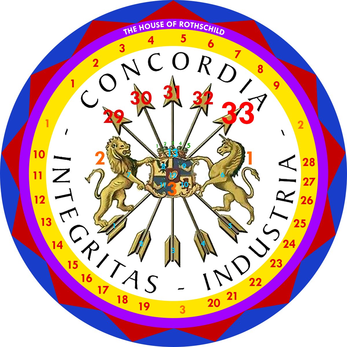 Concordia, Integritas, Industria consists of 28 letters and 3 words. Concordia, Integritas, Industria + The 5 Rothschild -Arrows = 28 letters + 5 arrows = 33