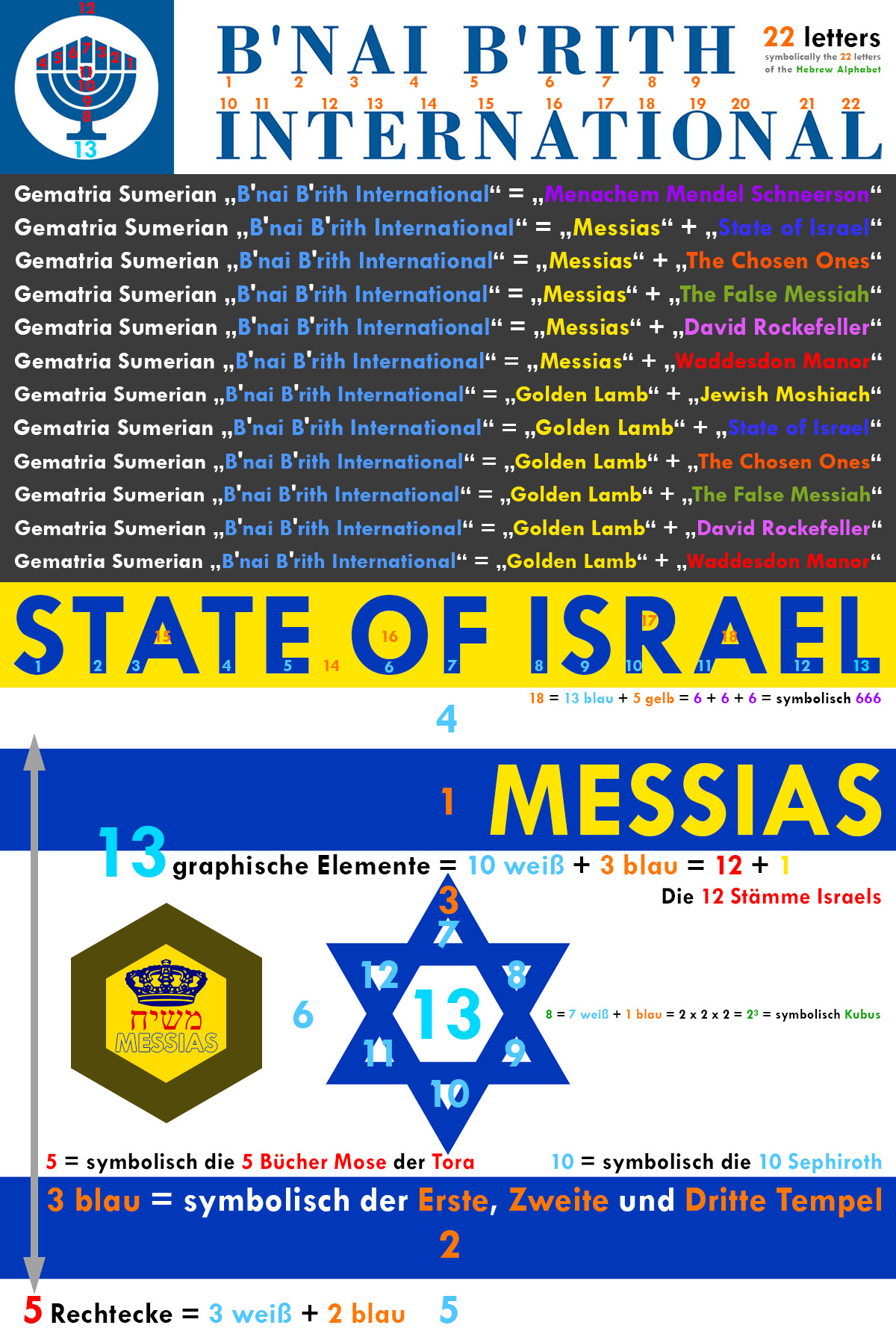 Quersumme 14.05.1948 = 1 + 4 + 5 + 1 + 9 + 4 + 8 = 5 + 5 + 10 + 12= 10 + 22 = 32 ---> Kabbala: 32 = 10 + 22