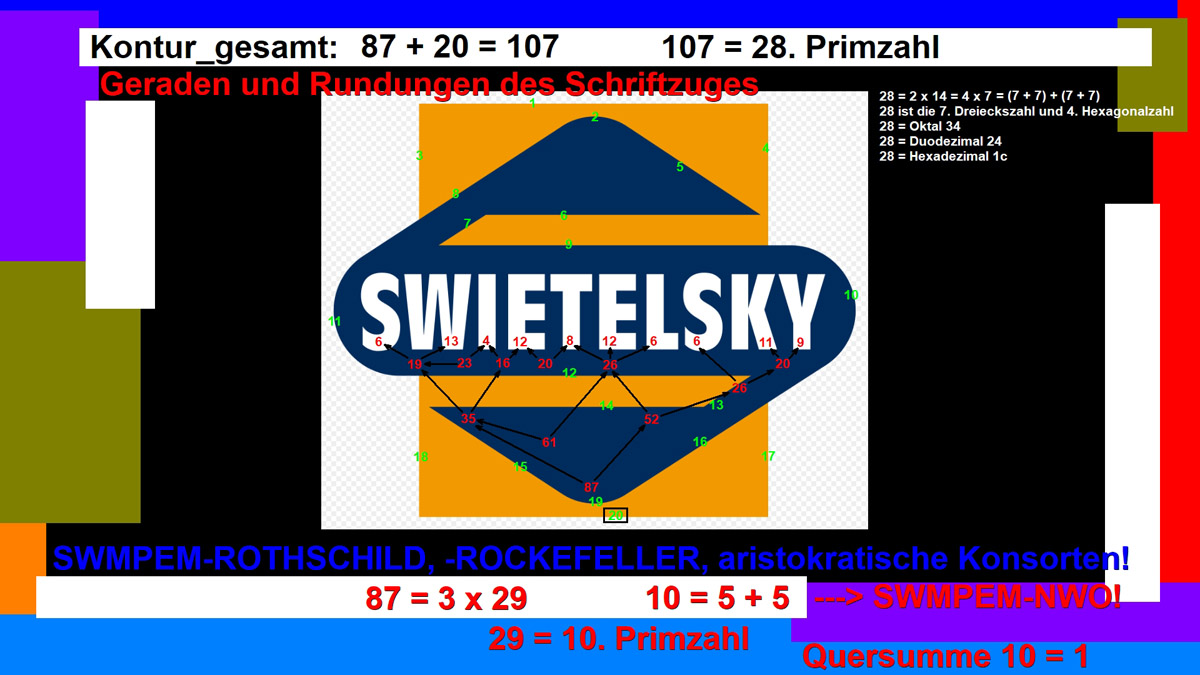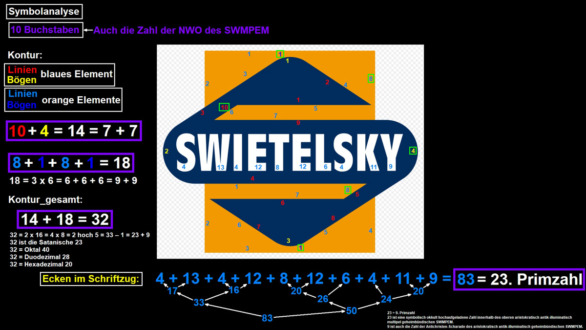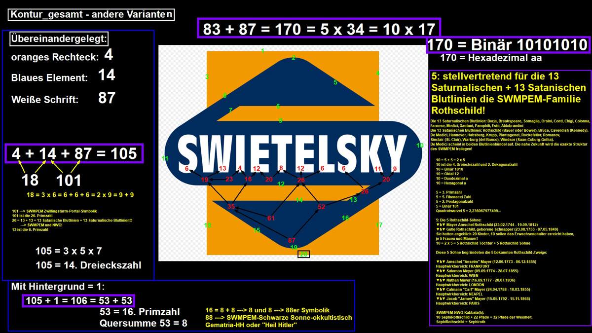 Freimaurerei bzw. Freimaurer steht auch als Synonym für das vielschichtige Geheimbündegeflecht des Elite-Netzwerks, die Jesuiten, die Sabbatanischen Frankisten undundund Freemason (Englisch)= Mason (Englisch_verkürzt) = Freimaurer (Deutsch) = SWMPEM-Geheimbündler Freemasonry (Englisch)= Masonry (Englisch_verkürzt) = Freimaurerei (Deutsch) = SWMPEM-Geheimbündelei Für die häufig auftauchenden Zahlen 71, 300 und der Vielfachen davon gilt unter anderem: 71 = 20. Primzahl = 1776 - 1717 + 12 = 1775 - 1717 + 13 = -33 + 137 - 33 = 32 + 23 + 8 + 8 = 53 + 18 = 55 + 16 = 55 + 8 + 8 = 88 - 17 = 54 + 17 = 48 + 23 = Oktal 107 = Duodezimal 5b = Hexadezimal 47 20 = 9+11 = IX+XI ---> 911 = IXXI _ 20: Das 20-Rothschild-Kinder-Konstrukt = 5+5+10 = 5♂+5♀+10 jung-† 300 = 2 x 2 x 3 x 5 x 5 = 24. Dreieckszahl = Oktal 454 = Duodezimal 210 = Hexadezimal 12c ---> K_O_M_I_T_E_E___D_E_R___300 = K_O_M_I_T_E_E___D_E_R___D_R_E_I_H_U_N_D_E_R_T 300 ---> Komitee der 300 Gematria "International Monetary Fund" Full Reduction = 119 = "ILLUMINATI" + 71 = "Rothschild" + 66 = "Rockefeller" + 63 = "Adolf Hitler" + 63 71 = 20. Primzahl = 1776 - 1717 + 12 = 1775 - 1717 + 13 = -33 + 137 - 33 = 32 + 23 + 8 + 8 = 53 + 18 = 55 + 16 = 55 + 8 + 8 = 88 - 17 = 54 + 17 = 48 + 23 = Oktal 107 = Duodezimal 5b = Hexadezimal 47 20 = 9+11 = IX+XI ---> 911 = IXXI _ 20: Das 20-Rothschild-Kinder-Konstrukt = 5+5+10 = 5♂+5♀+10 jung-† Single Reduction = 119 = "ILLUMINATI" + 71 = "Rothschild" + 57 = "Rockefeller" + 63 = "Adolf Hitler" + 63 English Ordinal = 308 = "ILLUMINATI" + 188 = "Rothschild" + 192 = "Rockefeller" + 198 = "Adolf Hitler" + 198 Sumerian = 1848 = "ILLUMINATI" + 1128 = "Rothschild" + 1152 = "Rockefeller" + 1188 = "Adolf Hitler" + 1188 = 2 x 2 x 2 x 3 x 7 x 11 = 42 x 44 = 21 x 88 = Oktal 3470 = Duodezimal 10a0 = Hexadezimal 738 1848 = 314 + 1534 = 2162 - 314 = 322 + 1526 = 2170 - 322 = 666 + 1182 = 2514 - 666 = 1717 + 131 = 3565 - 1717 = 1776 + 72 = 3624 - 1776 1534 = 2 x 13 x 59 = Oktal 2776 = Duodezimal a7a = Hexadezimal 5fe 2162 = 2 x 23 x 47 = Oktal 4162 = Duodezimal 1302 = Hexadezimal 872 1526 = 2 x 7 x 109 = Oktal 2766 = Duodezimal a72 = Hexadezimal 5f6 2170 = 2 x 5 x 7 x 31 = Oktal 4172 = Duodezimal 130a = Hexadezimal 87a 1182 = 2 x 3 x 197 = Oktal 2236 = Duodezimal 826 = Hexadezimal 49e 2514 = 2 x 3 x 419 = Oktal 4722 = Duodezimal 1556 = Hexadezimal 9d2 131 = 131 = Oktal 203 = Duodezimal ab = Hexadezimal 83 3565 = 5 x 23 x 31 = Oktal 6755 = Duodezimal 2091 = Hexadezimal ded 72 = 2 x 2 x 2 x 3 x 3 = Oktal 110 = Duodezimal 60 = Hexadezimal 48 3624 = 2 x 2 x 2 x 3 x 151 = Oktal 7050 = Duodezimal 2120 = Hexadezimal e28 Reverse Sumerian = 2202 = "ILLUMINATI" + 1302 = "Rothschild" + 1278 = "Rockefeller" + 1080 = "Adolf Hitler" + 1080 English Extended = 2261 = "ILLUMINATI" + 1583 = "Rothschild" + 1749 = "Rockefeller" + 1917 = "Adolf Hitler" + 1818 Reverse Ordinal = 367 = "ILLUMINATI" + 217 = "Rothschild" + 213 = "Rockefeller" + 180 = "Adolf Hitler" + 180 Jewish Reduced = 101 = "ILLUMINATI" + 59 = "Rothschild" + 44 = "Rockefeller" + 51 = "Adolf Hitler" + 50 Jewish Ordinal = 290 = "ILLUMINATI" + 176 = "Rothschild" + 179 = "Rockefeller" + 186 = "Adolf Hitler" + 185 Jewish = 1451 = "ILLUMINATI" + 1013 = "Rothschild" + 1079 = "Rockefeller" + 1167 = "Adolf Hitler" + 1148 = 230. Primzahl = Oktal 2653 = Duodezimal a0b = Hexadezimal 5ab 1451 = 314 + 1137 = 1765 - 314 = 322 + 1129 = 1773 - 322 = 666 + 785 = 2117 - 666 = 1717 - 266 = 3168 - 1717 = 1776 - 325 = 3227 - 1776 1137 = 3 x 379 = Oktal 2161 = Duodezimal 7a9 = Hexadezimal 471 1765 = 5 x 353 = Oktal 3345 = Duodezimal 1031 = Hexadezimal 6e5 1129 = 1129 = Oktal 2151 = Duodezimal 7a1 = Hexadezimal 469 1773 = 3 x 3 x 197 = Oktal 3355 = Duodezimal 1039 = Hexadezimal 6ed 785 = 5 x 157 = Oktal 1421 = Duodezimal 555 = Hexadezimal 311 2117 = 29 x 73 = Oktal 4105 = Duodezimal 1285 = Hexadezimal 845 266 = 2 x 7 x 19 = Oktal 412 = Duodezimal 1a2 = Hexadezimal 10a 3168 = 2 x 2 x 2 x 2 x 2 x 3 x 3 x 11 = 32 x 9 x 11 = 36 x 88 = 44 x 72 = (13 + 31) x 72 = (13 + 18 + 13) x 72 = Oktal 6140 = Duodezimal 1a00 = Hexadezimal c60 325 = 5 x 5 x 13 = Oktal 505 = Duodezimal 231 = Hexadezimal 145 3227 = 7 x 461 = Oktal 6233 = Duodezimal 1a4b = Hexadezimal c9b ALW Kabbalah = 358 = "ILLUMINATI" + 208 = "Rothschild" + 258 = "Rockefeller" + 208 = "Adolf Hitler" + 234 KFW Kabbalah = 342 = "ILLUMINATI" + 168 = "Rothschild" + 210 = "Rockefeller" + 216 = "Adolf Hitler" + 210 LCH Kabbalah = 336 = "ILLUMINATI" + 250 = "Rothschild" + 256 = "Rockefeller" + 226 = "Adolf Hitler" + 245 Septenary = 84 = "ILLUMINATI" + 49 = "Rothschild" + 38 = "Rockefeller" + 41 = "Adolf Hitler" + 39 Satanic = 1183 = "ILLUMINATI" + 713 = "Rothschild" + 717 = "Rockefeller" + 688 = "Adolf Hitler" + 688 Franc Baconis = 613 = "ILLUMINATI" + 383 = "Rothschild" + 382 = "Rockefeller" + 394 = "Adolf Hitler" + 395 Primes = 986 = "ILLUMINATI" + 613 = "Rothschild" + 630 = "Rockefeller" + 661 = "Adolf Hitler" + 658 Trigonal = 2616 = "ILLUMINATI" + 1687 = "Rothschild" + 1714 = "Rockefeller" + 1860 = "Adolf Hitler" + 1831 Squares = 4924 = "ILLUMINATI" + 3186 = "Rothschild" + 3236 = "Rockefeller" + 3522 = "Adolf Hitler" + 3464 Full Reduction = 119 = 167 - "ILLUMINATI" = 172 - "Rothschild" = 175 - "Rockefeller" = 175 - "Adolf Hitler" Single Reduction = 119 = 167 - "ILLUMINATI" = 181 - "Rothschild" = 175 - "Rockefeller" = 175 - "Adolf Hitler" English Ordinal = 308 = 428 - "ILLUMINATI" = 424 - "Rothschild" = 418 - "Rockefeller" = 418 - "Adolf Hitler" Sumerian = 1848 = 2568 - "ILLUMINATI" = 2544 - "Rothschild" = 2508 - "Rockefeller" = 2508 - "Adolf Hitler" Reverse Sumerian = 2202 = 3102 - "ILLUMINATI" = 3126 - "Rothschild" = 3324 - "Rockefeller" = 3324 - "Adolf Hitler" English Extended = 2261 = 2939 - "ILLUMINATI" = 2773 - "Rothschild" = 2605 - "Rockefeller" = 2704 - "Adolf Hitler" Reverse Ordinal = 367 = 517 - "ILLUMINATI" = 521 - "Rothschild" = 554 - "Rockefeller" = 554 - "Adolf Hitler" Jewish Reduced = 101 = 143 - "ILLUMINATI" = 158 - "Rothsch