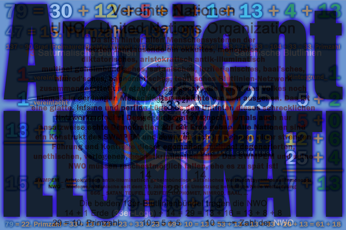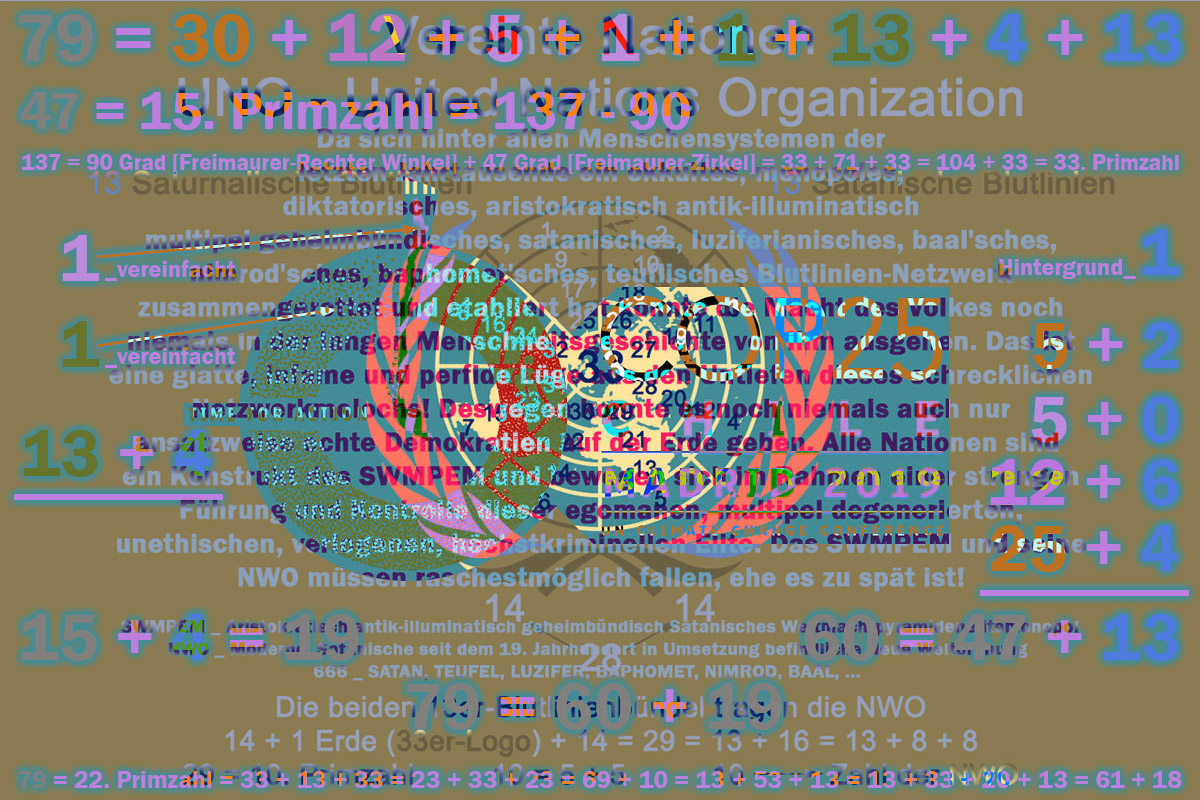 mit all den anderen relevanten einflußreichen internationalen und nationalen Organisationen der Welt die verächtliche Neue Weltordnung (New World Order - NWO) vorantriebe. Unsere Welt ist sehr stark und divers fragmentiert. Hinter allem und auch den jeweiligen Gründungen aller gegenwärtig etwa 200 Nationen in unserer verlogenen SWMPEM-Welt steht ein monopoles, konkurrenzloses Netzwerk, besagtes aristokratisch antik-illuminatisch multipel geheimbündisches Blutlinien-konnotiertes SWMPEM. Allerortens hält sich die Elite eine bunte Schaar politischer, ökonomischer, kultureller, religiöser, ... Bewegungen und die ahnungslose unbedarfte Menschheit in Schach. Einige Politikerscheinungen nehmen besonders bizarre Züge an und treiben skurrile Blüten. Vielen Protagonisten düfte der Ernst der Lage gar nicht bewußt sein und sie laufen weiter in ihrem beengten Hamsterrad eingefahrener gruppendynamischer Zwänge genau dorthin wohin sie von den starken fast unsichtbaren SWMPEM-NWO-Kräften gezwungen werden. ▼♄▼ Gematria Jewish "Third Temple United Nations" = 1109 = 186. Primzahl = K_O_M_I_T_E_E___D_E_R___300 + I__L__L__U__M__I__N__A__T__I + 71 + K_O_M_I_T_E_E___D_E_R___300 Gematria Jewish "Third Temple United Nations" = R__O__T__H__S__C__H__I__L__D + 666 + 71 = R__O__T__H__S__C__H__I__L__D + SIX HUNDRED THREESCORE AND SIX + 71 Gematria Jewish "Third Temple United Nations" = 1109 = A__D__O__L__F_____H__I__T__L__E__R + (13 + 13) x (13 + 18) Gematria Jewish "Third Temple United Nations" = 1109 = A__D__O__L__F_____H__I__T__L__E__R + 1717 - 911 = A__D__O__L__F_____H__I__T__L__E__R + G_r_ü_n_d_u_n_g___d_e_r___m_o_d_e_r_n_e_n___F__R__E__I__M__A__U__R__E__R__E__I - IXXI Gematria Jewish "Third Temple United Nations" = 1109 = 1776 - ( 666 + 1) = 1776 - (666 + "ONE") = Duodezimal 1776 - 1717 Gematria Jewish "Third Temple United Nations" = 1109 = 1775 - 666 = G__R__Ü__N__D__U__N__G____C__H__A__B__A__D---L__U__B__A__V__I__T__C__H - SIX HUNDRED THREESCORE AND SIX 18 ---> unter vielem anderen satanisch krank SWMPEM-NWO-Schwarze Sonne-okkultistisch Gematria-AH oder "Adolf Hitler" 18 = 2 x 3² = 3 x 6 = 6 + 6 + 6 = 9 + 9 = 3. Heptagonalzahl = Oktal 22 = Duodezimal 16 = Hexadezimal 12 71 = 20. Primzahl = 1776 - 1717 + 12 = 1775 - 1717 + 13 = -33 + 137 - 33 = 32 + 23 + 8 + 8 = 53 + 18 = 55 + 16 = 55 + 8 + 8 = 88 - 17 = 54 + 17 = 48 + 23 = Oktal 107 = Duodezimal 5b = Hexadezimal 47 20 = 9+11 = IX+XI ---> 911 = IXXI _ 20: Das 20-Rothschild-Kinder-Konstrukt = 5+5+10 = 5♂+5♀+10 jung-† 186 = 2 x 3 x 31 = 93 + 93 = A_L_E_I_S_T_E_R___C_R_O_W_L_E_Y_S___T_H_E_L_E_M_A + A_L_E_I_S_T_E_R___C_R_O_W_L_E_Y_S___T_H_E_L_E_M_A = Oktal 272 = Duodezimal 136 = Hexadezimal ba 93 = 3 x 31 = A_L_E_I_S_T_E_R___C_R_O_W_L_E_Y_S___T_H_E_L_E_M_A = Oktal 135 = Duodezimal 79 = Hexadezimal 5d ---> Aleister Crowleys Thelema 31 = 11. Primzahl = 13 + 18 = Satanische 13 und umgekehrt = Binär 11111 = Oktal 37 = Duodezimal 27 = Hexadezimal 1f 13 = 6. Primzahl = 12 + 1 = 12 + "ONE" = 7. Fibonacci Zahl = Binär 1101 = Oktal 15 = Duodezimal 11 = Hexadezimal d "ONE" = Messias, ... und häufig auch Falscher Messias, englisch False Messiah, Antichrist, verschiedene SWMPEM-Lügen-Konstruktionen, ... 6 = 1. vollkommene oder perfekte Zahl Die 13 Saturnalischen Blutlinien: Borja, Breakspeare, Somaglia, Orsini, Conti, Chigi, Colonna, Farnese, Medici, Gaetani, Pamphili, Este, Aldobrandini Die 13 Satanischen Blutlinien: Rothschild (Bauer oder Bower), Bruce, Cavendish (Kennedy), De Medici, Hannover, Habsburg, Krupp, Plantagenet, Rockefeller, Romanov, Sinclair (St. Clair), Warburg (del Banco), Windsor (Saxe-Coburg-Gotha) De Medici scheint in beiden Blutlinienbündel auf. Die nahe Zukunft wird die exakte Struktur des SWMPEM freilegen! Gematria English Ordinal "Ancient Illuminati + United Nations" = 351 = 3 x 3 x 3 x 13 = 3³ x 13 = 3 x 7 x 59 - 888 = 26. Dreieckszahl = Binär 101011111 = Oktal 537 = Duodezimal 253 = Hexadezimal 15f 351. Dreieckszahl = 61776 = 2 x 2 x 2 x 2 x 3 x 3 x 3 x 11 x 13 = 11 x 13 x 432 = (12 - "ONE") x (12 + "ONE") x 432 = (English Ordinal "ILLUMINATI" + 23) x 432 351. Dreieckszahl = 61776 = (English Ordinal "ILLUMINATI" + 13 + N__E__W_____W__O__R__L__D_____O__R__D__E__R) x 432 351. Dreieckszahl = 61776 = 60000 + 1776 = 200 x K_O_M_I_T_E_E___D_E_R___300 + 1776 = 888 + ((9 + 11) x N__E__W_____W__O__R__L__D_____O__R__D__E__R) x K_O_M_I_T_E_E___D_E_R___300 + 888 351. Dreieckszahl = 61776 = 8 x 7722 = 2³ x 07722 Braunau am Inn ---> Detail am Rande: Telefonvorwahl 5280 Braunau am Inn = 07722 8 ist als 2³ ein 3-dimensionaler, räumlicher 2er-SWMPEM-Kubus, formt sich graphisch modifiziert aus der 33 und bildet die um 90 Grad bzw. im Rechten Winkel aufgestellte Unendlichkeit ab! 8 = 2 x 2 x 2 = 2³ = 4 + 4 ---> Oktogon oder Oktagon 59 = 17. Primzahl = (1776 - 1717) = (1775 - 1717 + 1) = (1775 - 1717 + "ONE")= 13 + 33 + 13 = 23 + 13 + 23 = 49 + 10 = 101 - 42 = 32 + 27 = 41 + 18 = 18 + 23 + 18 = 888 - 829 = Oktal 73 = Duodezimal 4b = Hexadezimal 3b "ONE" = Messias, ... und häufig auch Falscher Messias, englisch False Messiah, Antichrist, verschiedene SWMPEM-Lügen-Konstruktionen, ... 17 = 7. Primzahl = 10 + 7 = 88 - 71 = 33 - 16 = Oktal 21 = Duodezimal 15 = Hexadezimal 11 Pyramide (7) = Quadrat (4) + Dreieck (3) 432 = Vierhundertzweiunddreißig 432 = 2⁴ x 3³= 20² + 32 = 2 x 6³ = 6 x 6 x 6 + 6 x 6 x 6 = 314 + 118 = 746 - 314 = 322 + 110 = 754 - 322 = 666 - 234 = 1098 - 666 = 1717 - 1285 = 2149 - 1717 = 1776 - 1344 = 2208 - 1776 = Oktal 660 = Duodezimal 300 = Hexadezimal 1b0 Duodezimal 300 ---> Symbolik: 300 ---> SWMPEM-NWO-Komitee der 300