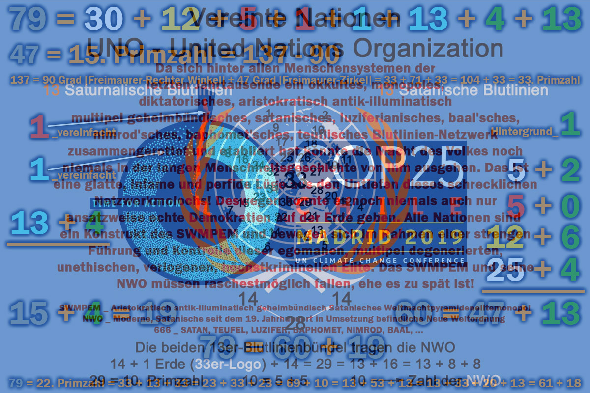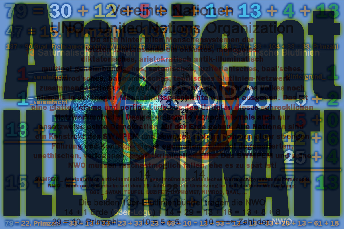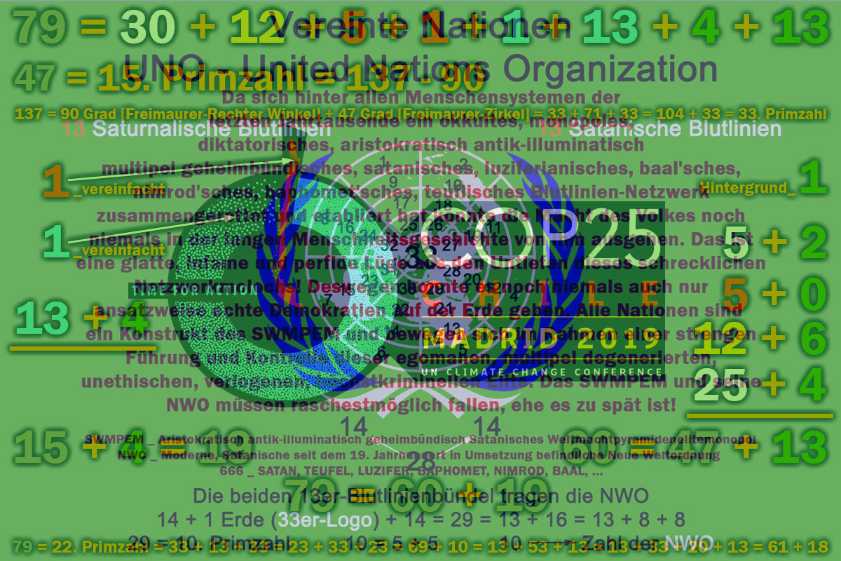 Gematria "United Nations Climate Change Conference" Full Reduction = 165 = "ILLUMINATI" + 117 = "Rothschild" + 112 = "Rockefeller" + 109 = "Adolf Hitler" + 109 Single Reduction = 174 = "ILLUMINATI" + 126 = "Rothschild" + 112 = "Rockefeller" + 118 = "Adolf Hitler" + 118 English Ordinal = 354 = "ILLUMINATI" + 234 = "Rothschild" + 238 = "Rockefeller" + 244 = "Adolf Hitler" + 244 = 2 x 3 x 59 = Oktal 542 = Duodezimal 256 = Hexadezimal 162 59 = 17. Primzahl = (1776 - 1717) = (1775 - 1717 + 1) = (1775 - 1717 + "ONE")= 13 + 33 + 13 = 23 + 13 + 23 = 49 + 10 = 101 - 42 = 32 + 27 = 41 + 18 = 18 + 23 + 18 = 888 - 829 = Oktal 73 = Duodezimal 4b = Hexadezimal 3b "ONE" = Messias, ... und häufig auch Falscher Messias, englisch False Messiah, Antichrist, verschiedene SWMPEM-Lügen-Konstruktionen, ... 17 = 7. Primzahl = 10 + 7 = 88 - 71 = 33 - 16 = Oktal 21 = Duodezimal 15 = Hexadezimal 11 Pyramide (7) = Quadrat (4) + Dreieck (3) 354 = 314 + 40 = 668 - 314 = 322 + 32 = 676 - 322 = 666 - 312 = 1020 - 666 = 1717 - 1363 = 2071 - 1717 = 1776 - 1422 = 2130 - 1776 40 = 2 x 2 x 2 x 5 = Oktal 50 = Duodezimal 34 = Hexadezimal 28 668 = 2 x 2 x 167 = Oktal 1234 = Duodezimal 478 = Hexadezimal 29c 32 = 2 x 2 x 2 x 2 x 2 = Oktal 40 = Duodezimal 28 = Hexadezimal 20 676 = 2 x 2 x 13 x 13 = Oktal 1244 = Duodezimal 484 = Hexadezimal 2a4 312 = 2 x 2 x 2 x 3 x 13 = Oktal 470 = Duodezimal 220 = Hexadezimal 138 1020 = 2 x 2 x 3 x 5 x 17 = Oktal 1774 = Duodezimal 710 = Hexadezimal 3fc 1363 = 29 x 47 = Oktal 2523 = Duodezimal 957 = Hexadezimal 553 2071 = 19 x 109 = Oktal 4027 = Duodezimal 1247 = Hexadezimal 817 1422 = 2 x 3 x 3 x 79 = Oktal 2616 = Duodezimal 9a6 = Hexadezimal 58e 2130 = 2 x 3 x 5 x 71 = Oktal 4122 = Duodezimal 1296 = Hexadezimal 852 71 = 20. Primzahl = 1776 - 1717 + 12 = 1775 - 1717 + 13 = -33 + 137 - 33 = 32 + 23 + 8 + 8 = 53 + 18 = 55 + 16 = 55 + 8 + 8 = 88 - 17 = 54 + 17 = 48 + 23 = Oktal 107 = Duodezimal 5b = Hexadezimal 47 20 = 9+11 = IX+XI ---> 911 = IXXI _ 20: Das 20-Rothschild-Kinder-Konstrukt = 5+5+10 = 5♂+5♀+10 jung-† Sumerian = 2124 = "ILLUMINATI" + 1404 = "Rothschild" + 1428 = "Rockefeller" + 1464 = "Adolf Hitler" + 1464 = 2 x 2 x 3 x 3 x 59 = 36 x 59 = Oktal 4114 = Duodezimal 1290 = Hexadezimal 84c 59 = 17. Primzahl = (1776 - 1717) = (1775 - 1717 + 1) = (1775 - 1717 + "ONE")= 13 + 33 + 13 = 23 + 13 + 23 = 49 + 10 = 101 - 42 = 32 + 27 = 41 + 18 = 18 + 23 + 18 = 888 - 829 = Oktal 73 = Duodezimal 4b = Hexadezimal 3b "ONE" = Messias, ... und häufig auch Falscher Messias, englisch False Messiah, Antichrist, verschiedene SWMPEM-Lügen-Konstruktionen, ... 17 = 7. Primzahl = 10 + 7 = 88 - 71 = 33 - 16 = Oktal 21 = Duodezimal 15 = Hexadezimal 11 Pyramide (7) = Quadrat (4) + Dreieck (3) 2124 = 314 + 1810 = 2438 - 314 = 322 + 1802 = 2446 - 322 = 666 + 1458 = 2790 - 666 = 1717 + 407 = 3841 - 1717 = 1776 + 348 = 3900 - 1776 1810 = 2 x 5 x 181 = Oktal 3422 = Duodezimal 106a = Hexadezimal 712 2438 = 2 x 23 x 53 = Oktal 4606 = Duodezimal 14b2 = Hexadezimal 986 1802 = 2 x 17 x 53 = Oktal 3412 = Duodezimal 1062 = Hexadezimal 70a 2446 = 2 x 1223 = Oktal 4616 = Duodezimal 14ba = Hexadezimal 98e 1458 = 2 x 3 x 3 x 3 x 3 x 3 x 3 = Oktal 2662 = Duodezimal a16 = Hexadezimal 5b2 2790 = 2 x 3 x 3 x 5 x 31 = Oktal 5346 = Duodezimal 1746 = Hexadezimal ae6 407 = 11 x 37 = Oktal 627 = Duodezimal 29b = Hexadezimal 197 3841 = 23 x 167 = Oktal 7401 = Duodezimal 2281 = Hexadezimal f01 348 = 2 x 2 x 3 x 29 = Oktal 534 = Duodezimal 250 = Hexadezimal 15c 3900 = 2 x 2 x 3 x 5 x 5 x 13 = Oktal 7474 = Duodezimal 2310 = Hexadezimal f3c Reverse Sumerian = 3708 = "ILLUMINATI" + 2808 = "Rothschild" + 2784 = "Rockefeller" + 2586 = "Adolf Hitler" + 2586 English Extended = 1677 = "ILLUMINATI" + 999 = "Rothschild" + 1165 = "Rockefeller" + 1333 = "Adolf Hitler" + 1234 Reverse Ordinal = 618 = "ILLUMINATI" + 468 = "Rothschild" + 464 = "Rockefeller" + 431 = "Adolf Hitler" + 431 Jewish Reduced = 158 = "ILLUMINATI" + 116 = "Rothschild" + 101 = "Rockefeller" + 108 = "Adolf Hitler" + 107 Jewish Ordinal = 338 = "ILLUMINATI" + 224 = "Rothschild" + 227 = "Rockefeller" + 234 = "Adolf Hitler" + 233 Jewish = 1157 = "ILLUMINATI" + 719 = "Rothschild" + 785 = "Rockefeller" + 873 = "Adolf Hitler" + 854 = 13 x 89 = 13 x (71 + 18) = 13 x (88 + 1) = 13 x (88 + "ONE") = Oktal 2205 = Duodezimal 805 = Hexadezimal 485 89 = 24. Primzahl = 101 - 12 = 71 + 18 = 88 + 1 = 88 + "ONE" = 11. Fibonacci Zahl = Oktal 131 88 = 2³ x 11 = 55 + 33 = 2³ x (5 + 6) = 71 + 17 11 = 5 + 6 = Pentagramm + Hexagramm = Pentagon + Hexagon 13 = 6. Primzahl = 12 + 1 = 12 + "ONE" = 7. Fibonacci Zahl = Binär 1101 = Oktal 15 = Duodezimal 11 = Hexadezimal d "ONE" = Messias, ... und häufig auch Falscher Messias, englisch False Messiah, Antichrist, verschiedene SWMPEM-Lügen-Konstruktionen, ... 6 = 1. vollkommene oder perfekte Zahl 12 = 2 x 2 x 3 = 3 x 2 x 2 = 2 x 3 x 2 = 3. Pentagonalzahl = Oktal 14 = Duodezimal 10 = Hexadezimal c 12 ---> Unter vielem anderen bilden die 12 Stämme Israels nach der Überlieferung des Tanach das Volk Israel. Um nicht falsch verstanden zu werden: Ich bin ein großer Freund ausnahmslos aller echten Religionen, aller Ethnien, aller Nationen inklusive Palästina, Israel, Kashmir, Indien, Pakistan, Afghanistan, Kurdistan, Türkei, Syrien, Tibet, China, Honkong, USA, ..., jedoch naturgegeben ein großer Feind des dahinter agierenden aristokratisch antik-illuminatisch multipel geheimbündischen Blutlinien-konnotierten SWMPEM und deren verächtlicher NWO! Die 13 Saturnalischen Blutlinien: Borja, Breakspeare, Somaglia, Orsini, Conti, Chigi, Colonna, Farnese, Medici, Gaetani, Pamphili, Este, Aldobrandini Die 13 Satanischen Blutlinien: Rothschild (Bauer oder Bower), Bruce, Cavendish (Kennedy), De Medici, Hannover, Habsburg, Krupp, Plantagenet, Rockefeller, Romanov, Sinclair (St. Clair), Warburg (del Banco), Windsor (Saxe-Coburg-Gotha) De Medici scheint in beiden Blutlinienbündel auf. Die nahe Zukunft wird die exakte Struktur des SWMPEM freilegen! 71 = 20. Primzahl = 17