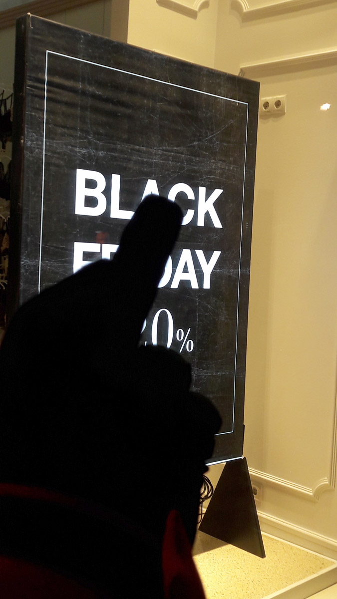 | Black Friday [Black Nobility Friday] (Schwarzer Freitag [Schwarzer Hochadels Freitag]) wird in den Vereinigten Staaten der Freitag nach Thanksgiving genannt. Da Thanksgiving immer auf den vierten Donnerstag im November fällt, gilt der darauffolgende Black Friday als Start in ein traditionelles Familienwochenende und als Beginn der SWMPEM-NWO-Weltwirtschafts-wahnsinnigen Weihnachtseinkaufsaison. Weihnachten ist freilich in Ordnung, die degenerierte Weltwirtschaft, seine geheimbündischen Profiteure und das obere SWMPEM-Netzwerk ganz im Gegenteil! |
