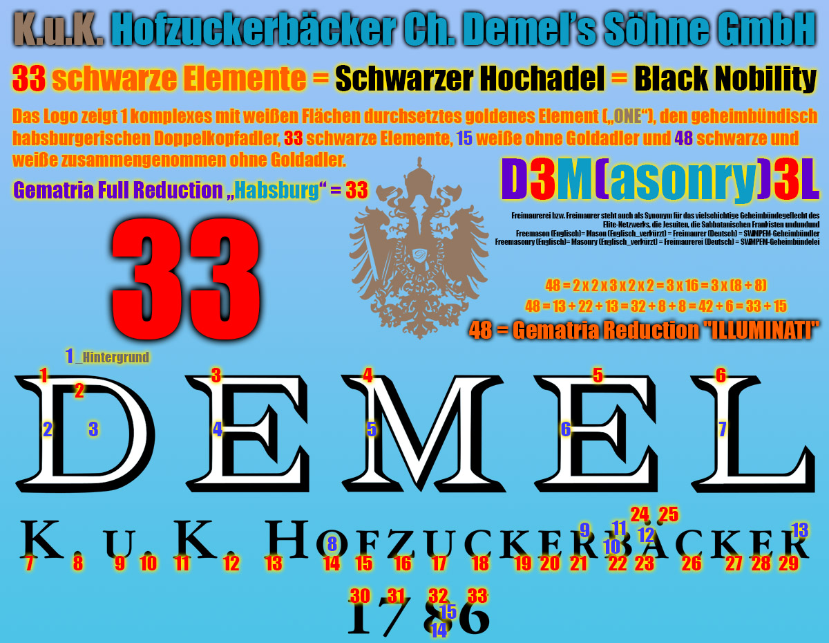 Freimaurerei bzw. Freimaurer steht auch als Synonym für das vielschichtige Geheimbündegeflecht des Elite-Netzwerks, die Jesuiten, die Sabbatanischen Frankisten undundund Freemason (Englisch)= Mason (Englisch_verkürzt) = Freimaurer (Deutsch) = SWMPEM-Geheimbündler Freemasonry (Englisch)= Masonry (Englisch_verkürzt) = Freimaurerei (Deutsch) = SWMPEM-Geheimbündelei Für die häufig auftauchenden Zahlen 71, 300 und der Vielfachen davon gilt unter anderem: 71 = 20. Primzahl = 1776 - 1717 + 12 = 1775 - 1717 + 13 = -33 + 137 - 33 = 32 + 23 + 8 + 8 = 53 + 18 = 55 + 16 = 55 + 8 + 8 = 88 - 17 = 54 + 17 = 48 + 23 = Oktal 107 = Duodezimal 5b = Hexadezimal 47 20 = 9+11 = IX+XI ---> 911 = IXXI _ 20: Das 20-Rothschild-Kinder-Konstrukt = 5+5+10 = 5♂+5♀+10 jung-† 300 = 2 x 2 x 3 x 5 x 5 = 24. Dreieckszahl = Oktal 454 = Duodezimal 210 = Hexadezimal 12c ---> K_O_M_I_T_E_E___D_E_R___300 = K_O_M_I_T_E_E___D_E_R___D_R_E_I_H_U_N_D_E_R_T Gematria "Simmering" Full Reduction = 53 = "ILLUMINATI" + 5 = "Rothschild" = "Rockefeller" - 3 = "Adolf Hitler" - 3 Single Reduction = 62 = "ILLUMINATI" + 14 = "Rothschild" = "Rockefeller" + 6 = "Adolf Hitler" + 6 English Ordinal = 107 = "ILLUMINATI" - 13 = "Rothschild" - 9 = "Rockefeller" - 3 = "Adolf Hitler" - 3 Sumerian = 642 = "ILLUMINATI" - 78 = "Rothschild" - 54 = "Rockefeller" - 18 = "Adolf Hitler" - 18 Reverse Sumerian = 816 = "ILLUMINATI" - 84 = "Rothschild" - 108 = "Rockefeller" - 306 = "Adolf Hitler" - 306 English Extended = 350 = "ILLUMINATI" - 328 = "Rothschild" - 162 = "Rockefeller" + 6 = "Adolf Hitler" - 93 Reverse Ordinal = 136 = "ILLUMINATI" - 14 = "Rothschild" - 18 = "Rockefeller" - 51 = "Adolf Hitler" - 51 Jewish Reduced = 57 = "ILLUMINATI" + 15 = "Rothschild" = "Rockefeller" + 7 = "Adolf Hitler" + 6 Jewish Ordinal = 102 = "ILLUMINATI" - 12 = "Rothschild" - 9 = "Rockefeller" - 2 = "Adolf Hitler" - 3 Jewish = 300 = "ILLUMINATI" - 138 = "Rothschild" - 72 = "Rockefeller" + 16 = "Adolf Hitler" - 3 ALW Kabbalah = 155 = "ILLUMINATI" + 5 = "Rothschild" + 55 = "Rockefeller" + 5 = "Adolf Hitler" + 31 KFW Kabbalah = 139 = "ILLUMINATI" - 35 = "Rothschild" + 7 = "Rockefeller" + 13 = "Adolf Hitler" + 7 LCH Kabbalah = 119 = "ILLUMINATI" + 33 = "Rothschild" + 39 = "Rockefeller" + 9 = "Adolf Hitler" + 28 Septenary = 36 = "ILLUMINATI" + 1 = "Rothschild" - 10 = "Rockefeller" - 7 = "Adolf Hitler" - 9 Satanic = 422 = "ILLUMINATI" - 48 = "Rothschild" - 44 = "Rockefeller" - 73 = "Adolf Hitler" - 73 Franc Baconis = 213 = "ILLUMINATI" - 17 = "Rothschild" - 18 = "Rockefeller" - 6 = "Adolf Hitler" - 5 Primes = 327 = "ILLUMINATI" - 46 = "Rothschild" - 29 = "Rockefeller" + 2 = "Adolf Hitler" - 1 Trigonal = 781 = "ILLUMINATI" - 148 = "Rothschild" - 121 = "Rockefeller" + 25 = "Adolf Hitler" - 4 Squares = 1455 = "ILLUMINATI" - 283 = "Rothschild" - 233 = "Rockefeller" + 53 = "Adolf Hitler" - 5 Full Reduction = 53 = 101 - "ILLUMINATI" = 106 - "Rothschild" = 109 - "Rockefeller" = 109 - "Adolf Hitler" Single Reduction = 62 = 110 - "ILLUMINATI" = 124 - "Rothschild" = 118 - "Rockefeller" = 118 - "Adolf Hitler" English Ordinal = 107 = 227 - "ILLUMINATI" = 223 - "Rothschild" = 217 - "Rockefeller" = 217 - "Adolf Hitler" Sumerian = 642 = 1362 - "ILLUMINATI" = 1338 - "Rothschild" = 1302 - "Rockefeller" = 1302 - "Adolf Hitler" Reverse Sumerian = 816 = 1716 - "ILLUMINATI" = 1740 - "Rothschild" = 1938 - "Rockefeller" = 1938 - "Adolf Hitler" English Extended = 350 = 1028 - "ILLUMINATI" = 862 - "Rothschild" = 694 - "Rockefeller" = 793 - "Adolf Hitler" Reverse Ordinal = 136 = 286 - "ILLUMINATI" = 290 - "Rothschild" = 323 - "Rockefeller" = 323 - "Adolf Hitler" Jewish Reduced = 57 = 99 - "ILLUMINATI" = 114 - "Rothschild" = 107 - "Rockefeller" = 108 - "Adolf Hitler" Jewish Ordinal = 102 = 216 - "ILLUMINATI" = 213 - "Rothschild" = 206 - "Rockefeller" = 207 - "Adolf Hitler" Jewish = 300 = 738 - "ILLUMINATI" = 672 - "Rothschild" = 584 - "Rockefeller" = 603 - "Adolf Hitler" ALW Kabbalah = 155 = 305 - "ILLUMINATI" = 255 - "Rothschild" = 305 - "Rockefeller" = 279 - "Adolf Hitler" KFW Kabbalah = 139 = 313 - "ILLUMINATI" = 271 - "Rothschild" = 265 - "Rockefeller" = 271 - "Adolf Hitler" LCH Kabbalah = 119 = 205 - "ILLUMINATI" = 199 - "Rothschild" = 229 - "Rockefeller" = 210 - "Adolf Hitler" Septenary = 36 = 71 - "ILLUMINATI" = 82 - "Rothschild" = 79 - "Rockefeller" = 81 - "Adolf Hitler" Satanic = 422 = 892 - "ILLUMINATI" = 888 - "Rothschild" = 917 - "Rockefeller" = 917 - "Adolf Hitler" Franc Baconis = 213 = 443 - "ILLUMINATI" = 444 - "Rothschild" = 432 - "Rockefeller" = 431 - "Adolf Hitler" Primes = 327 = 700 - "ILLUMINATI" = 683 - "Rothschild" = 652 - "Rockefeller" = 655 - "Adolf Hitler" Trigonal = 781 = 1710 - "ILLUMINATI" = 1683 - "Rothschild" = 1537 - "Rockefeller" = 1566 - "Adolf Hitler" Squares = 1455 = 3193 - "ILLUMINATI" = 3143 - "Rothschild" = 2857 - "Rockefeller" = 2915 - "Adolf Hitler" Gematria "Habsburg + Simmering" Full Reduction = 86 = "ILLUMINATI" + 38 = "Rothschild" + 33 = "Rockefeller" + 30 = "Adolf Hitler" + 30 Single Reduction = 104 = "ILLUMINATI" + 56 = "Rothschild" + 42 = "Rockefeller" + 48 = "Adolf Hitler" + 48 English Ordinal = 185 = "ILLUMINATI" + 65 = "Rothschild" + 69 = "Rockefeller" + 75 = "Adolf Hitler" + 75 Sumerian = 1110 = "ILLUMINATI" + 390 = "Rothschild" + 414 = "Rockefeller" + 450 = "Adolf Hitler" + 450 Reverse Sumerian = 1644 = "ILLUMINATI" + 744 = "Rothschild" + 720 = "Rockefeller" + 522 = "Adolf Hitler" + 522 English Extended = 860 = "ILLUMINATI" + 182 = "Rothschild" + 348 = "Rockefeller" + 516 = "Adolf Hitler" + 417 Reverse Ordinal = 274 = "ILLUMINATI" + 124 = "Rothschild" + 120 = "Rockefeller" + 87 = "Adolf Hitler" + 87 Jewish Reduced = 96 = "ILLUMINATI" + 54 = "Rothschild" + 39 = "Rockefeller" + 46 = "Adolf Hitler" + 45 Jewish Ordinal = 177 = "ILLUMINATI" + 63 = "Rothschild" + 66 = "Rockefeller" + 73 = "Adolf Hitler" + 72 Jewish = 690 = "ILLUMINATI" + 252 = "Rothschild" + 318 = "Rockefeller" + 406 = "Adolf Hitler" + 387 ALW Kabbalah = 245 = "ILLUMINATI" + 95 = "Roths