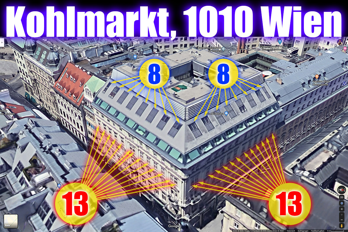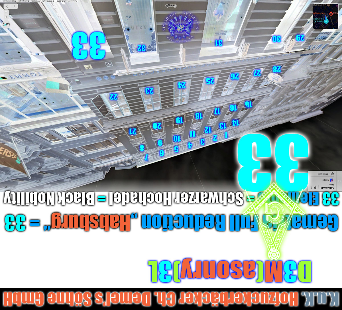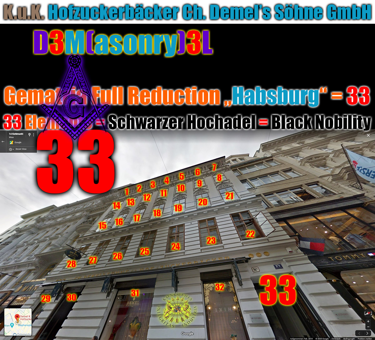 Gematria "Kohlmarkt" Full Reduction = 37 = "ILLUMINATI" - 11 = "Rothschild" - 16 = "Rockefeller" - 19 = "Adolf Hitler" - 19 Single Reduction = 37 = "ILLUMINATI" - 11 = "Rothschild" - 25 = "Rockefeller" - 19 = "Adolf Hitler" - 19 English Ordinal = 109 = "ILLUMINATI" - 11 = "Rothschild" - 7 = "Rockefeller" - 1 = "Adolf Hitler" - 1 Sumerian = 654 = "ILLUMINATI" - 66 = "Rothschild" - 42 = "Rockefeller" - 6 = "Adolf Hitler" - 6 Reverse Sumerian = 804 = "ILLUMINATI" - 96 = "Rothschild" - 120 = "Rockefeller" - 318 = "Adolf Hitler" - 318 English Extended = 469 = "ILLUMINATI" - 209 = "Rothschild" - 43 = "Rockefeller" + 125 = "Adolf Hitler" + 26 Reverse Ordinal = 134 = "ILLUMINATI" - 16 = "Rothschild" - 20 = "Rockefeller" - 53 = "Adolf Hitler" - 53 Jewish Reduced = 30 = "ILLUMINATI" - 12 = "Rothschild" - 27 = "Rockefeller" - 20 = "Adolf Hitler" - 21 Jewish Ordinal = 102 = "ILLUMINATI" - 12 = "Rothschild" - 9 = "Rockefeller" - 2 = "Adolf Hitler" - 3 Jewish = 309 = "ILLUMINATI" - 129 = "Rothschild" - 63 = "Rockefeller" + 25 = "Adolf Hitler" + 6 ALW Kabbalah = 89 = "ILLUMINATI" - 61 = "Rothschild" - 11 = "Rockefeller" - 61 = "Adolf Hitler" - 35 KFW Kabbalah = 73 = "ILLUMINATI" - 101 = "Rothschild" - 59 = "Rockefeller" - 53 = "Adolf Hitler" - 59 LCH Kabbalah = 97 = "ILLUMINATI" + 11 = "Rothschild" + 17 = "Rockefeller" - 13 = "Adolf Hitler" + 6 Septenary = 30 = "ILLUMINATI" - 5 = "Rothschild" - 16 = "Rockefeller" - 13 = "Adolf Hitler" - 15 Satanic = 424 = "ILLUMINATI" - 46 = "Rothschild" - 42 = "Rockefeller" - 71 = "Adolf Hitler" - 71 Franc Baconis = 217 = "ILLUMINATI" - 13 = "Rothschild" - 14 = "Rockefeller" - 2 = "Adolf Hitler" - 1 Primes = 340 = "ILLUMINATI" - 33 = "Rothschild" - 16 = "Rockefeller" + 15 = "Adolf Hitler" + 12 Trigonal = 839 = "ILLUMINATI" - 90 = "Rothschild" - 63 = "Rockefeller" + 83 = "Adolf Hitler" + 54 Squares = 1569 = "ILLUMINATI" - 169 = "Rothschild" - 119 = "Rockefeller" + 167 = "Adolf Hitler" + 109 Full Reduction = 37 = 85 - "ILLUMINATI" = 90 - "Rothschild" = 93 - "Rockefeller" = 93 - "Adolf Hitler" Single Reduction = 37 = 85 - "ILLUMINATI" = 99 - "Rothschild" = 93 - "Rockefeller" = 93 - "Adolf Hitler" English Ordinal = 109 = 229 - "ILLUMINATI" = 225 - "Rothschild" = 219 - "Rockefeller" = 219 - "Adolf Hitler" Sumerian = 654 = 1374 - "ILLUMINATI" = 1350 - "Rothschild" = 1314 - "Rockefeller" = 1314 - "Adolf Hitler" Reverse Sumerian = 804 = 1704 - "ILLUMINATI" = 1728 - "Rothschild" = 1926 - "Rockefeller" = 1926 - "Adolf Hitler" English Extended = 469 = 1147 - "ILLUMINATI" = 981 - "Rothschild" = 813 - "Rockefeller" = 912 - "Adolf Hitler" Reverse Ordinal = 134 = 284 - "ILLUMINATI" = 288 - "Rothschild" = 321 - "Rockefeller" = 321 - "Adolf Hitler" Jewish Reduced = 30 = 72 - "ILLUMINATI" = 87 - "Rothschild" = 80 - "Rockefeller" = 81 - "Adolf Hitler" Jewish Ordinal = 102 = 216 - "ILLUMINATI" = 213 - "Rothschild" = 206 - "Rockefeller" = 207 - "Adolf Hitler" Jewish = 309 = 747 - "ILLUMINATI" = 681 - "Rothschild" = 593 - "Rockefeller" = 612 - "Adolf Hitler" ALW Kabbalah = 89 = 239 - "ILLUMINATI" = 189 - "Rothschild" = 239 - "Rockefeller" = 213 - "Adolf Hitler" KFW Kabbalah = 73 = 247 - "ILLUMINATI" = 205 - "Rothschild" = 199 - "Rockefeller" = 205 - "Adolf Hitler" LCH Kabbalah = 97 = 183 - "ILLUMINATI" = 177 - "Rothschild" = 207 - "Rockefeller" = 188 - "Adolf Hitler" Septenary = 30 = 65 - "ILLUMINATI" = 76 - "Rothschild" = 73 - "Rockefeller" = 75 - "Adolf Hitler" Satanic = 424 = 894 - "ILLUMINATI" = 890 - "Rothschild" = 919 - "Rockefeller" = 919 - "Adolf Hitler" Franc Baconis = 217 = 447 - "ILLUMINATI" = 448 - "Rothschild" = 436 - "Rockefeller" = 435 - "Adolf Hitler" Primes = 340 = 713 - "ILLUMINATI" = 696 - "Rothschild" = 665 - "Rockefeller" = 668 - "Adolf Hitler" Trigonal = 839 = 1768 - "ILLUMINATI" = 1741 - "Rothschild" = 1595 - "Rockefeller" = 1624 - "Adolf Hitler" Squares = 1569 = 3307 - "ILLUMINATI" = 3257 - "Rothschild" = 2971 - "Rockefeller" = 3029 - "Adolf Hitler" Gematria "Habsburg + Kohlmarkt" Full Reduction = 70 = "ILLUMINATI" + 22 = "Rothschild" + 17 = "Rockefeller" + 14 = "Adolf Hitler" + 14 Single Reduction = 79 = "ILLUMINATI" + 31 = "Rothschild" + 17 = "Rockefeller" + 23 = "Adolf Hitler" + 23 English Ordinal = 187 = "ILLUMINATI" + 67 = "Rothschild" + 71 = "Rockefeller" + 77 = "Adolf Hitler" + 77 Sumerian = 1122 = "ILLUMINATI" + 402 = "Rothschild" + 426 = "Rockefeller" + 462 = "Adolf Hitler" + 462 = 2 x 3 x 11 x 17 = 33 x 34 = Oktal 2142 = Duodezimal 796 = Hexadezimal 462 1122 = 314 + 808 = 1436 - 314 = 322 + 800 = 1444 - 322 = 666 + 456 = 1788 - 666 = 888 + 234 = 2010 - 888 = 911 + 211 = 2033 - 911 1122 = 1666 - 544 = 2788 - 1666 = 1717 - 595 = 2839 - 1717 = 1775 - 653 = 2897 - 1775 = 1776 - 654 = 2898 - 1776 808 = 2 x 2 x 2 x 101 = Oktal 1450 = Duodezimal 574 = Hexadezimal 328 1436 = 2 x 2 x 359 = Oktal 2634 = Duodezimal 9b8 = Hexadezimal 59c 800 = 2 x 2 x 2 x 2 x 2 x 5 x 5 = Oktal 1440 = Duodezimal 568 = Hexadezimal 320 1444 = 2 x 2 x 19 x 19 = Oktal 2644 = Duodezimal a04 = Hexadezimal 5a4 456 = 2 x 2 x 2 x 3 x 19 = Oktal 710 = Duodezimal 320 = Hexadezimal 1c8 1788 = 2 x 2 x 3 x 149 = Oktal 3374 = Duodezimal 1050 = Hexadezimal 6fc 234 = 2 x 3 x 3 x 13 = Oktal 352 = Duodezimal 176 = Hexadezimal ea 2010 = 2 x 3 x 5 x 67 = Oktal 3732 = Duodezimal 11b6 = Hexadezimal 7da 211 = 211 = Oktal 323 = Duodezimal 157 = Hexadezimal d3 2033 = 19 x 107 = Oktal 3761 = Duodezimal 1215 = Hexadezimal 7f1 544 = 2 x 2 x 2 x 2 x 2 x 17 = Oktal 1040 = Duodezimal 394 = Hexadezimal 220 2788 = 2 x 2 x 17 x 41 = Oktal 5344 = Duodezimal 1744 = Hexadezimal ae4 595 = 5 x 7 x 17 = Oktal 1123 = Duodezimal 417 = Hexadezimal 253 2839 = 17 x 167 = Oktal 5427 = Duodezimal 1787 = Hexadezimal b17 653 = 653 = Oktal 1215 = Duodezimal 465 = Hexadezimal 28d 2897 = 2897 = Oktal 5521 = Duodezimal 1815 = Hexadezimal b51 654 = 2 x 3 x 109 = Oktal 1216 = Duodezimal 466 = Hexadezimal 28e 2898 = 2 x 3 x 3 x 7 x 23 = Oktal 5522 = Duodezimal 1816 = Hexadezimal b52 Reverse Sumerian = 1632 = "ILLUMINATI" + 732 = "Rothschild"