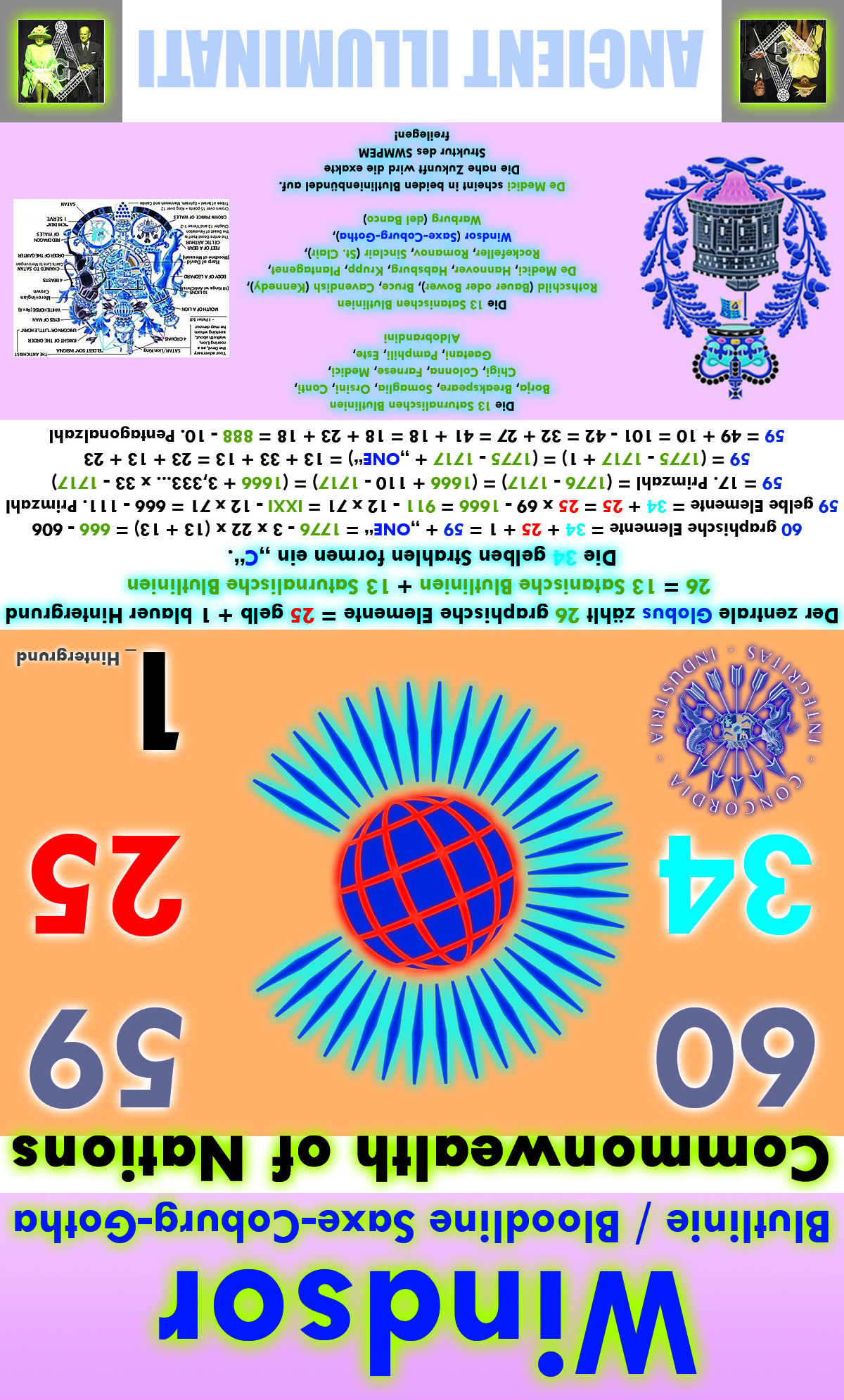 | Das Commonwealth of Nations (bis 1947 British Commonwealth of Nations) ist eine lose Verbindung souveräner SWMPEM-NWO-Staaten, die in erster Linie vom Vereinigten Königreich Großbritannien und Nordirland und dessen ehemaligen Kolonien gebildet wird. Die Gründung geht auf das Jahr 1931 zurück. Sportliches Großereignis des Commonwealth sind die alle 4 Jahre stattfindenden Commonwealth Games. Sitz der Organe: Marlborough House, London, Vereinigtes Königreich Vorsitz: Elisabeth II. (Oberhaupt, Teil des oberen SWMPEM-Netzwerks, Vorsitzende des Komitee der 300, .............) Patricia Scotland (Generalsekretärin, Befehlsempfängerin, Erfüllungsgehilfin, Agentin, Nutznießerin und Marionette des SWMPEM-Netzwerks) Boris Johnson (Vorsitzender, Befehlsempfänger, Erfüllungsgehilfe, Agent, Nutznießer und Marionette des SWMPEM-Netzwerks) Mitgliedstaaten: 54 = 2 x 3 x 3 x 3 = 3 x 18 = 72 - 18 = 1666 - 2 x 2 x 13 x 31 = Duodezimal 666 - 888 = 31 x 59 - 1775 = Oktal 66 = Duodezimal 46 = Hexadezimal 36 Gründung: 11.12.1931 (Statut von Westminster), 28.04.1949 (Erklärung von London) Quersumme 11.12.1931: 1 + 1 + 1 + 2 + 1 + 9 + 3 + 1 = 2 + 3 + 10 + 4 = 5 + 14 = 19 = 8. Primzahl ---> Quersumme 19 = 10 ---> Quersumme 10 = 1 Spezielle Quersumme 11.12.1931: 11 + 12 + 19 + 31 = 23 + 50 = 73 = 71 + 1 = 21. Primzahl = Oktal 111 Quersumme 28.04.1949: 2 + 8 + 4 + 1 + 9 + 4 + 9 = 10 + 4 + 10 + 13 = 14 + 23 = 37 = 12. Primzahl = 666 / (6 + 6 + 6) = 666 / (9 + 9) = 666 / 18 = Oktal 45 = Duodezimal 31 = Hexadezimal 25 ---> Quersumme 37 = 10 ---> Quersumme 10 = 1 Spezielle Quersumme 28.04.1949: 28 + 4 + 19 + 49 = 32 + 68 = 100 = 5 x 20 = 10 x 10 = 110 - 10 Der Globus besteht aus 88 Konturelementen! 88 = 2³ x 11 = 55 + 33 = 2³ x (5 + 6) = 71 + 17 _ 11 = 5 + 6 = Pentagramm + Hexagramm = Pentagon + Hexagon 88 ---> unter vielem anderen satanisch krank SWMPEM-NWO-Schwarze Sonne-okkultistisch Gematria-HH oder "Heil Hitler" Die gelben Strahlen werden jeweils von 10 Konturelementen begrenzt. Die gesamte Kontur zeigt 432 Elemente = 428 + 4 Randstrecken = 370 + 88 + 4 = 6 x 6 x 6 + 6 x 6 x 6 = Duodezimal 300 ---> Symbolik: Komitee der 300 = Committee of 300 432 = 2 x 2 x 2 x 2 x 3 x 3 x 3 = Oktal 660 = Duodezimal 300 = Hexadezimal 1b0 432 = Vierhundertzweiunddreißig 432 = 2⁴ x 3³= 20² + 32 = 2 x 6³ = 6 x 6 x 6 + 6 x 6 x 6 = 314 + 118 = 746 - 314 = 322 + 110 = 754 - 322 = 666 - 234 = 1098 - 666 = 1717 - 1285 = 2149 - 1717 = 1776 - 1344 = 2208 - 1776 = Oktal 660 = Duodezimal 300 = Hexadezimal 1b0 Duodezimal 300 ---> Symbolik: 300 ---> SWMPEM-NWO-Komitee der 300 118 = 2 x 59 = Oktal 166 = Duodezimal 9a = Hexadezimal 76 59 = 17. Primzahl = (1776 - 1717) = (1775 - 1717 + 1) = (1775 - 1717 + "ONE")= 13 + 33 + 13 = 23 + 13 + 23 = 49 + 10 = 101 - 42 = 32 + 27 = 41 + 18 = 18 + 23 + 18 = 888 - 829 = Oktal 73 = Duodezimal 4b = Hexadezimal 3b "ONE" = Messias, ... und häufig auch Falscher Messias, englisch False Messiah, Antichrist, verschiedene SWMPEM-Lügen-Konstruktionen, ... 17 = 7. Primzahl = 10 + 7 = 88 - 71 = 33 - 16 = Oktal 21 = Duodezimal 15 = Hexadezimal 11 Pyramide (7) = Quadrat (4) + Dreieck (3) 746 = 2 x 373 = Oktal 1352 = Duodezimal 522 = Hexadezimal 2ea _ 373 = 74. Primzahl = 353 + 20 _ 353 = 71. Primzahl 71 = 20. Primzahl = 1776 - 1717 + 12 = 1775 - 1717 + 13 = -33 + 137 - 33 = 32 + 23 + 8 + 8 = 53 + 18 = 55 + 16 = 55 + 8 + 8 = 88 - 17 = 54 + 17 = 48 + 23 = Oktal 107 = Duodezimal 5b = Hexadezimal 47 20 = 9+11 = IX+XI ---> 911 = IXXI _ 20: Das 20-Rothschild-Kinder-Konstrukt = 5+5+10 = 5♂+5♀+10 jung-† 110 = 2 x 5 x 11 = 10 x 11 = 3,333… x 33 = English Ordinal "Rockefeller" = English Ordinal "Adolf Hitler" = Oktal 156 = Duodezimal 92 = Hexadezimal 6e 754 = 2 x 13 x 29 = (13 + 13) x 29 = Oktal 1362 = Duodezimal 52a = Hexadezimal 2f2 234 = 2 x 3² x 13 = 13 x 18 = 9 x (13 + 13) = Oktal 352 = Duodezimal 176 = Hexadezimal ea 1098 = 2 x 3² x 61 = 18 x 61 = Oktal 2112 = Duodezimal 776 = Hexadezimal 44a _ 61 = 18. Primzahl 1285 = 5 x 257 = Oktal 2405 = Duodezimal 8b1 = Hexadezimal 505 _ 257 = 55. Primzahl = Hexadezimal 101 2149 = 7 x 307 = Oktal 4145 = Duodezimal 12b1 = Hexadezimal 865 _ 307 = 63. Primzahl 1344 = 2⁶ x 3 x 7 = 21 x 64 = 32 x 42 = 32 x (32 + 10) = 7 x 48 = 7 x Reduction "ILLUMINATI" = Oktal 2500 = Duodezimal 940 = Hexadezimal 540 64 = 2 x 32 = 8² = 8 x 8 = SWMPEM-Schachbrett mit 32 weißen Quadraten & 32 schwarzen Quadraten = 01.05.1776 - 04.07.1776 in Tagen _ Kabbala: 32 = 10 + 22 42 = 19 + 23 = 18 + 24 = 2 x 3 x 7 = 6 x 7 = 6 SWMPEM-Pyramiden = 32 + 10 = 71 - 29 = 13 + 13 + 8 + 8 = 21 + 21 = 3 x 14 ---> 3,14 = Pi_gerundet _ 42 = Satanische 24 und umgekehrt! 2208 = 2⁵ x 3 x 23 = 32 x 69 = 46 x 48 = (13 + 20 + 13) x Reduction "ILLUMINATI" = Oktal 4240 = Duodezimal 1340 = Hexadezimal 8a0 _ Kabbala: 32 = 10 + 22 69 = 3 x 23 = 13 + 23 + 33 = 53 + 16 = 53 + 8 + 8 = 49 + 20 = Binär 1000101 _ 69 ---> Der 3. Freimaurer-(Mittel-)Turm ---> SWMPEM-Portal