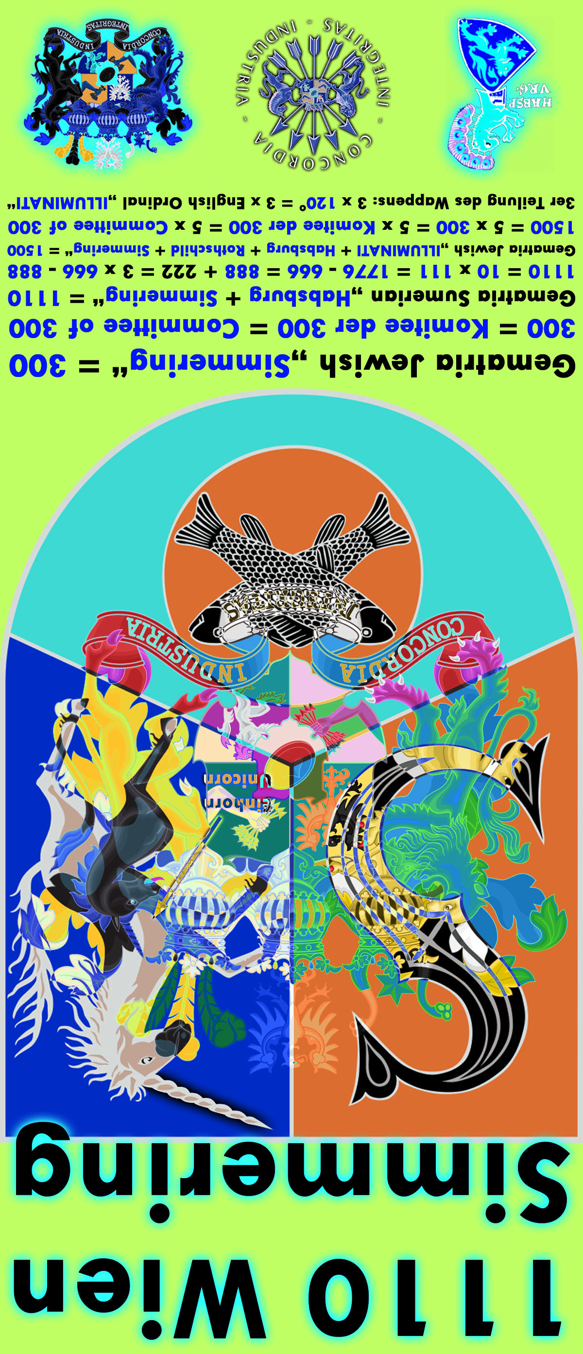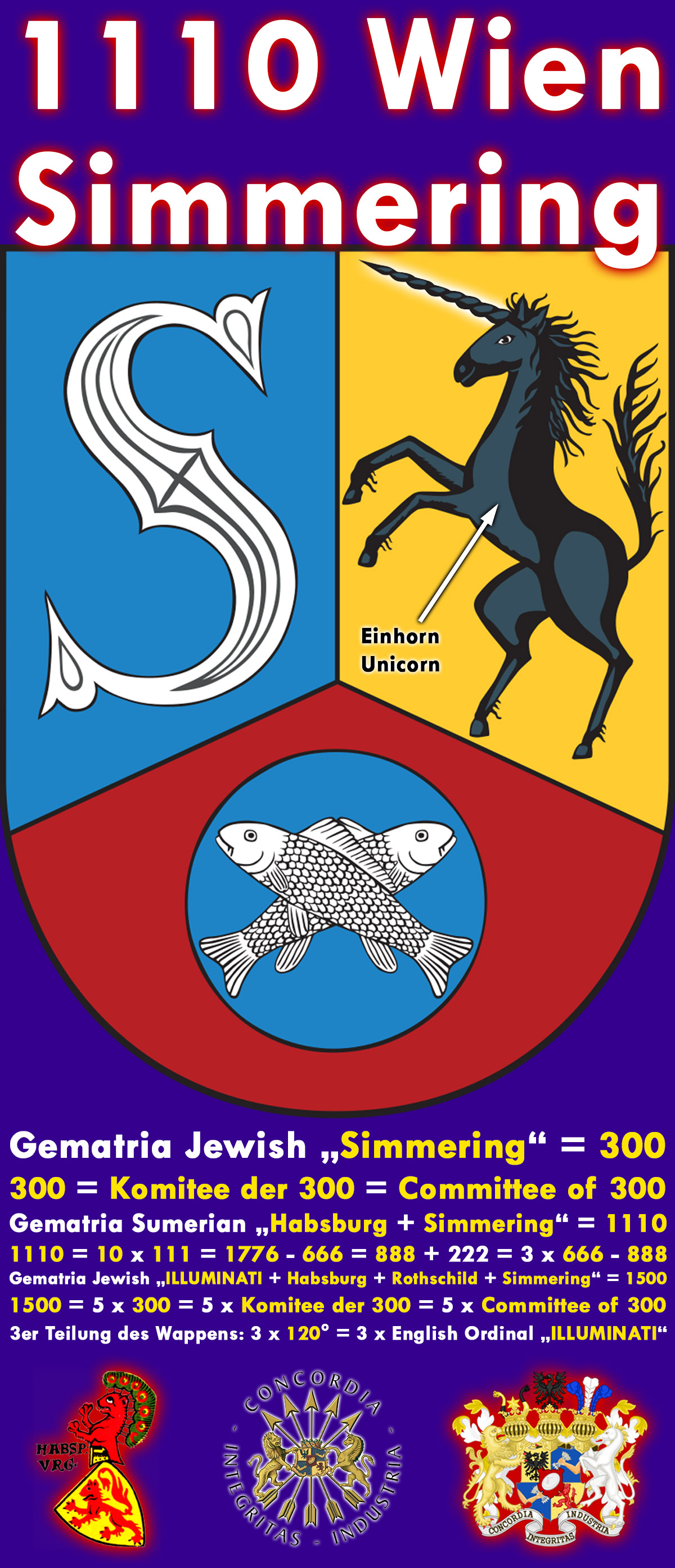 | Simmering ist der 11. Wiener Gemeindebezirk (1110 Wien _ Österreich _ Austria). Er wurde 1892 aus den selbstständigen Gemeinden Simmering und Kaiserebersdorf (Kaiser ---> die SWMPEM-NWO-Blutlinie Habsburg) sowie kleinen Teilen anderer Gemeinden gebildet. 1956 kam die bis 1938 eigenständige Gemeinde Albern hinzu. 1110 Wien = 2 x 3 x 5 x 37 = 10 x 111 = N__E__W_____W__O__R__L__D_____O__R__D__E__R x 111 = 1776 - 666 = 888 + 222 = 3 x 666 - 888 = 1717 - 607= Siebzehnhundertsechsundsiebzig minus Sechshundertsechsundsechzig 607 = 111. Primzahl = Oktal 1137 = Duodezimal 427 = Hexadezimal 25f 111 = 3 x 37 = 101 + 10 = 71 + 40 = 88 + 23 = 6. Nonagonalzahl = Oktal 157 = Duodezimal 93 = Hexadezimal 6f 222 = 2 x 3 x 37 = Oktal 336 = Duodezimal 166 = Hexadezimal de ---> Symbolik: Deutschland Unter den Wiener Bezirken ist Simmering als klassischer Arbeiter- und Industriebezirk und als Standort des größten Friedhofs Österreichs, des Wiener Zentralfriedhofs, bekannt. Durch den Bezirk verlaufen fast alle Verkehrsverbindungen Wiens mit östlich und südöstlich der Stadt gelegenen Gebieten in Österreich und seinen Nachbarländern. Das Wappen des 11. Bezirks ist dreigeteilt und steht für die 3 ehemaligen Gemeinden, aus denen der Bezirk gebildet wurde. Das silberne "S" auf blauem Grund steht für den Bezirksteil Simmering. Das springende Einhorn auf goldenem Grund steht wiederum für Kaiserebersdorf. Es stammt aus dem Wappen derer von Hintperg-Ebersdorf, die die Grundherrschaft des Gebietes ursprünglich innehatten. Der dritte, untere Wappenteil zeigt das Symbol der früheren Gemeinde Albern. Die auf rotem Grund abgebildeten gekreuzten Fische stehen dabei für den Fischfang, der in Albern eine alte Tradition hatte. Kaiser ---> die SWMPEM-NWO-Blutlinie Habsburg ---> Auch die Wappen der SWMPEM-NWO-Familien Rothschild und Windsor werden von einem Einhorn (Unicorn) geschmückt!