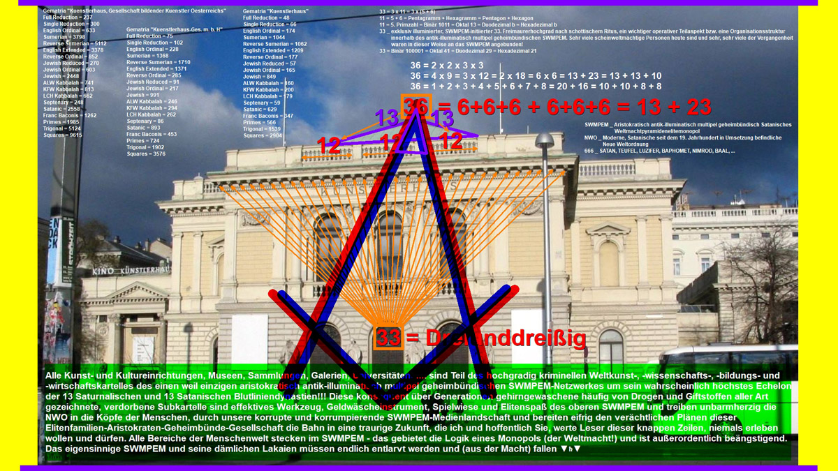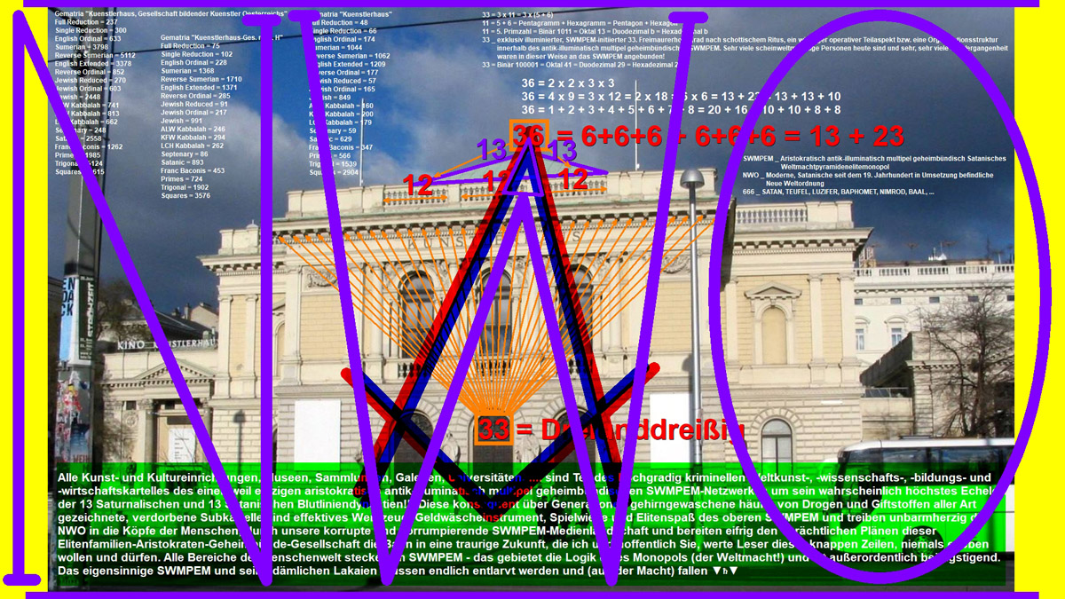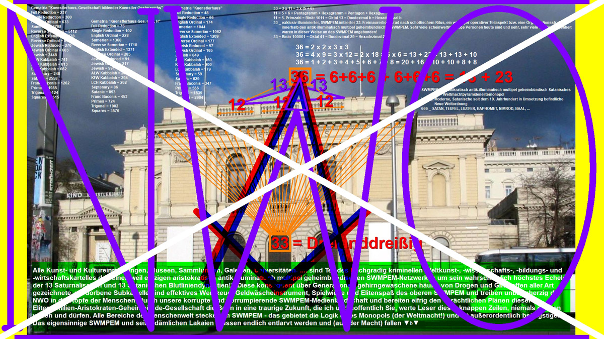 | Die Gesellschaft bildender Künstler Österreichs, Künstlerhaus wurde am 29.04.1861 als "Genossenschaft der bildenden Künstler Wiens" gegründet und ist eine SWMPEM-NWO-Künstlervereinigung, die das Kunstleben Österreichs maßgebend prägte. Der laut Eigendefinition "unabhängige, private Verein mit knapp 500 Künstlermitgliedern aus den Bereichen Malerei, Bildhauerei, Architektur, angewandte Kunst und Film versteht sich als Plattform für Kunstschaffende und Kunstinteressierte sowie als Sprachrohr seiner Mitglieder in kulturpolitischen Anliegen". Ungleich anderer österreichischer Künstlervereinigungen, wie etwa des Hagenbunds, wurde die heute "Künstlerhaus, Gesellschaft bildender Künstlerinnen und Künstler Österreichs" genannte Vereinigung nie aufgelöst oder verboten. Die kunsthistorisch bedeutende, avantgardistische Bewegung der Wiener Secession bezog sich bei ihrer "Abspaltung" vom Künstlerhaus Wien im Jahr 1897, namentlich auf ihre Abkehr vom damals in der Gesellschaft bildender Künstler vorherrschenden traditionellen Konservatismus. Gematria Reverse Sumerian "SIX HUNDRED THREESCORE AND SIX + Kuenstlerhaus, Gesellschaft bildender Kuenstlerinnen und Kuenstler Oesterreichs" = 8880 = 10 x 888 = 5 x 1776