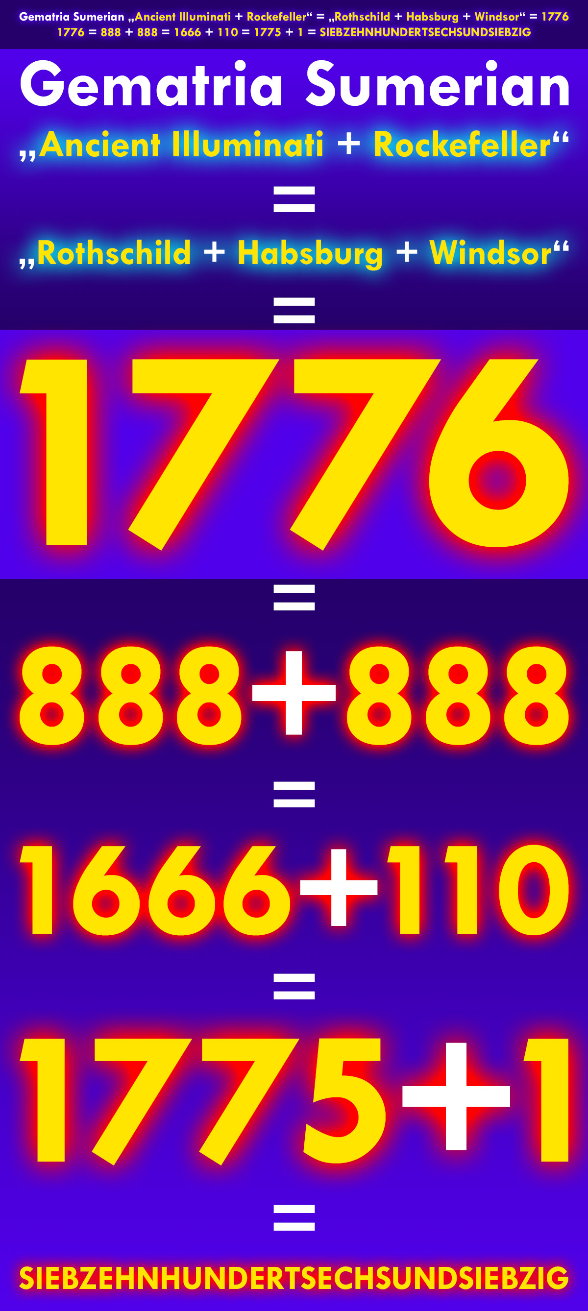 1776 = 1666 + 110 = 1666 + English Ordinal "Rockefeller" = Year 1666 of the proclamation the False Messiah Sabbatai Zevi would be the Jewish Messiah + 3,333... x 33 = 1775 + 1 = 1775 + "ONE" 1776 = 1656 + 120 = 23 x 72 + English Ordinal "ILLUMINATI"= 23 x (71 + "ONE") + English Ordinal "ILLUMINATI" = 1896 - 120 = 2 x 2 x 2 x 3 x 79 - English Ordinal "ILLUMINATI" 1776 = 1056 + 720 = 32 x 33 + Sumerian "ILLUMINATI" = 12 x 88 + Sumerian "ILLUMINATI" = 2496 - 720 = 3 x 13 x 64 - Sumerian "ILLUMINATI" = 2 x 12 x (71 + 33) - Sumerian "ILLUMINATI" 1776 = 1338 + 438 = 2 x 3 x 223 + Jewish "ILLUMINATI" = 2 x 3 x (222 + "ONE") + Jewish "ILLUMINATI" = 2214 - 438 = 2 x 3 x 3 x 3 x 41 - Jewish "ILLUMINATI" 1776 = 2 x ((18 + 6) x 37) = 2 x (666 + 222) = 4 x 12 x 37 = (12 + 12 + 12 + 12) x 12. Primzahl = (18 + 12 + 18) x 12. Primzahl = (12 + 13 + 33) x 12. Primzahl = ((6 + 6 + 6) + 12 + (6 + 6 + 6)) x 12. Primzahl 1776 = 12 x 148 = 12 x (77 + 71) = 12 x (147 + 1) = 12 x (3 x 49 + "ONE") = 12 x (149 - "ONE") = 12 x (101 + Reduction "ILLUMINATI" - "ONE") = 12 x (1776 + 89 - 1717) = 12 x (1776 + 88 - 1717 + "ONE") = 12 x (1776 + 90 - 1717 - "ONE") 1776 = ((9 + 9) + 12 + (9 + 9)) x 12. Primzahl = ((13 + 5) + 12 + (5 + 13)) x 12. Primzahl 1776 = (13 Saturnalischen Blutlinien + symbolisch (Rothschild_Frankfurt + Rothschild_Wien + Rothschild_London + Rothschild_Paris + Rothschild_Neapel) + 12 Stämme Israels + (symbolisch (Rothschild_Frankfurt + Rothschild_Wien + Rothschild_London + Rothschild_Paris + Rothschild_Neapel) + 13 Satanischen Blutlinien) x 12 Stämme Israelsste Primzahl 1776 = (13 Saturnalischen Blutlinien + symbolisch (Rothschild_Frankfurt + Rothschild_Wien + Rothschild_London + Rothschild_Paris + Rothschild_Neapel) + 12 Stämme Israels + (symbolisch (Rothschild_Frankfurt + Rothschild_Wien + Rothschild_London + Rothschild_Paris + Rothschild_Neapel) + 13 Satanischen Blutlinien) x (13 Saturnalischen Blutlinien + 13 Satanischen Blutlinien + 12 Stämme Israels - "ONE") 888 = 2 x 2 x 2 x 3 x 37 = 24 x 37 = (12 + 12) x 37 = (12 + 12) x 12. Primzahl = 8 x 111 = 1776 / 2 = Achthundertachtundachtzig ▼♄▼ 01.05.1776_Ingolstadt_Freistaat Bayern_BRD_EU_Erde_Welt ---> Gründung der Bayerischen Illuminaten innerhalb des antik-illuminatisch multipel geheimbündischen SWMPEM-Netzwerks ▼♄▼ 04.07.1776_SWMPEM-Scheinunabhängigkeitsscharade, -Lüge, -False Flag Inszenierung mit den 13 Gründerstaaten der USA ▼♄▼ 01.05.1776 - 04.07.1776 = 64 Tage = 64 graphische Elemente der Flagge der USA = 2 x 32 = 8² = 8 x 8 = SWMPEM-Schachbrett mit 32 weiße Quadrate & 32 schwarze Quadrate ---> Kabbala: 32 = 10 + 22 Flagge der USA: 64 graphische Elemente = 7 Streifen ROT(H) + 6 Streifen WEISS + 50 Pentagramme WEISS + 1 BLAU = 7 ROT(H) + 56 WEISS + "ONE" BLAU = 63 + 1 = 32 + 32 = 33 + 31 = 33 + 13 + 18 = 01.05.1776 - 04.07.1776 in Tagen "ONE" = Messias, ... und häufig auch Falscher Messias, englisch False Messiah, Antichrist, verschiedene SWMPEM-Lügen-Konstruktionen, ... 12 = 2 x 2 x 3 = 3 x 2 x 2 = 2 x 3 x 2 = 3. Pentagonalzahl = Oktal 14 = Duodezimal 10 = Hexadezimal c 12 ---> Unter vielem anderen bilden die 12 Stämme Israels nach der Überlieferung des Tanach das Volk Israel. 13 = 6. Primzahl = 12 + 1 = 12 + "ONE" = 7. Fibonacci Zahl = Binär 1101 = Oktal 15 = Duodezimal 11 = Hexadezimal d 6 = 1. vollkommene oder perfekte Zahl Um nicht falsch verstanden zu werden: Ich bin ein großer Freund ausnahmslos aller echten Religionen, aller Ethnien, aller Nationen inklusive Palästina, Israel, Kashmir, Indien, Pakistan, Afghanistan, Kurdistan, Türkei, Syrien, Tibet, China, Hongkong, USA, ..., jedoch naturgegeben ein großer Feind des dahinter agierenden aristokratisch antik-illuminatisch multipel geheimbündischen Blutlinien-konnotierten SWMPEM und deren verächtlicher NWO! ▼♄▼ Die 13 Saturnalischen Blutlinien: Borja, Breakspeare, Somaglia, Orsini, Conti, Chigi, Colonna, Farnese, Medici, Gaetani, Pamphili, Este, Aldobrandini ▼♄▼ Die 13 Satanischen Blutlinien: Rothschild (Bauer oder Bower), Bruce, Cavendish (Kennedy), De Medici, Hannover, Habsburg, Krupp, Plantagenet, Rockefeller, Romanov, Sinclair (St. Clair), Warburg (del Banco), Windsor (Saxe-Coburg-Gotha) De Medici scheint in beiden Blutlinienbündel auf. Die nahe Zukunft wird die exakte Struktur des SWMPEM freilegen! ▼♄▼ 1666 = Year 1666 of the proclamation the False Messiah Sabbatai Zevi would be the Jewish Messiah The Sabbateans (or Sabbatians) were a variety of followers of disciples and believers in Sabbatai Zevi (1626–1676), a Jewish rabbi who was proclaimed to be the Jewish Messiah (for real the False Messiah) in 1666 by Nathan of Gaza. Vast numbers of Jews in the Jewish diaspora accepted his claims, even after he became a Jewish apostate with his conversion to Islam in the same year. Sabbatai Zevi's followers, both during his "Messiahship" (for real a False Messiahship) and after his conversion to Islam, are known as Sabbateans. They can be grouped into three: "Maaminim" (believers), "Haberim" (associates), and "Ba'ale Milhamah" (warriors). Nathan Benjamin ben Elisha Hayyim ha'Levi Ashkenazi / Ghazzati or Nathan of Gaza (Hebrew: נתן העזתי; 1643–1680) was a theologian and author born in Jerusalem. After his marriage in 1663 he moved to Gaza, where he became famous as a prophet for the alleged messiah, Sabbatai Zevi. ▼♄▼ Sabbatai Zevi = Falscher Messias, englisch False Messiah = SWMPEM-Lügen-Konstruktion ▼♄▼ ▼♄▼ 1775 = 5 x 5 x 71 = 1776 - 1 = 1776 - "ONE" = G__R__Ü__N__D__U__N__G____C__H__A__B__A__D---L__U__B__A__V__I__T__C__H = Oktal 3357 = Duodezimal 103b = Hexadezimal 6ef Das Jahr 1776 = 1775 + 1 = 1775 + "ONE" = G__R__Ü__N__D__U__N__G____C__H__A__B__A__D---L__U__B__A__V__I__T__C__H + "ONE" 71 = 20. Primzahl = 1776 - 1717 + 12 = 1775 - 1717 + 13 = -33 + 137 - 33 = 32 + 23 + 8 + 8 = 53 + 18 = 55 + 16 = 55 + 8 + 8 = 88 - 17 = 54 + 17 = 48 + 23 = Oktal 107 = Duodezimal 5b = Hexadezimal 47 20 = 9+11 = IX+XI