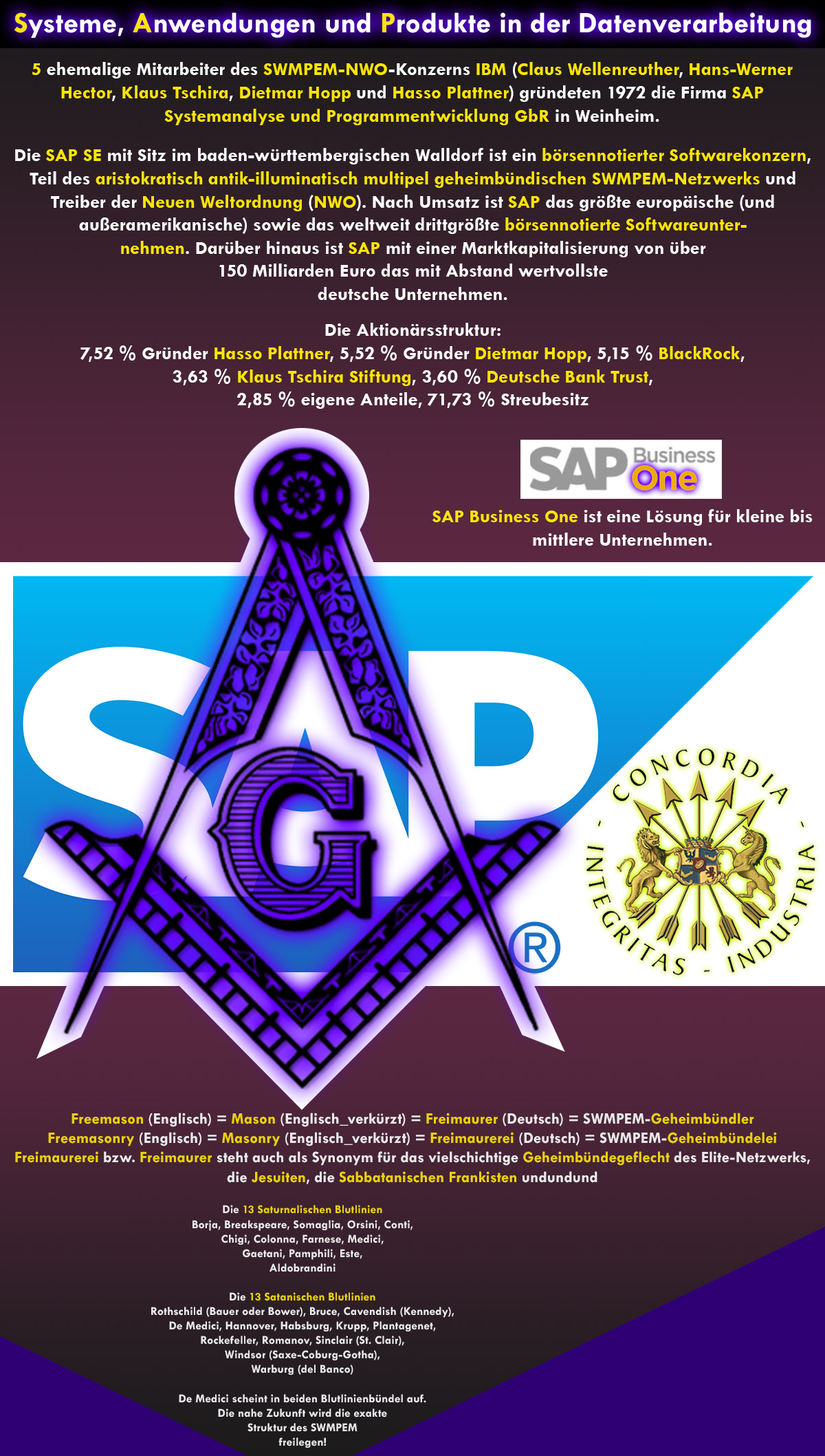| Alle eng verwachsenen nationalen & vordringlichst internationalen Geld-, Banken-, Nationalbanken-, Börsen-, Wirtschafts-, Politik-, Bildungs-, Universitäts-, Wissenschafts-, Kunst-, Geheimbünde-, Religions-, Rechts-, Geheimdienste-, Militärsysteme der Welt und alle anderen Belange unseres Menschendaseins sind vom partiell okkulten aristokratisch antik-illuminatischen SWMPEM-Netzwerk erschaffen, bis in die Gegenwart entwickelt worden und fest in seiner Hand! All die fürchterlichen Kriege sind von dieser Elite perfide in unsere Welt getragen, über die gehirngewaschene hintergangene Weltbevölkerung gebracht worden und dienen niederen Zwecken, Zielen, Begierden und der raschen in groben Zügen vorgeplanten Weiterentwicklung unserer Menschenwelt nach den Richtlinien der Neuen Weltordnung. Die schmutzige unethische vom SWMPEM-Netzwerk kontrollierte Weltwirtschaft und seine geheimbündisch vernetzten Proponenten sind eines der Hauptinstrumente dieser luziferianischen, satanischen, abartigen Elite und dienen ihrem großen Ziel der Verwirklichung des dystopischen NWO-Plans. Dem verlogenen und kriminellen oberen SWMPEM-Netzwerk ist in Wahrheit niemals etwas heilig gewesen. Das Fühlen, Handeln, systematische Korrumpieren, das Lenken der Weltgeschicke ist einer über Jahrhunderte kultivierten, aristokratisch geheimbündisch möchtegerngottartigen Präpotenz geschuldet, ausschließlich dem eigenen Wohl, Gelüsten und häufig kranken Begierden verpflichtet und die illuminierten, ins obere SWMPEM initiierten Individuen sind sich selber egoman am Nächsten. Sie hatten nie das Recht gehabt die Erde in Besitz zu nehmen und diktatorisch über alles zu herrschen. Sie haben es sich einfach genommen und müssen dafür endlich zur Verantwortung gezogen werden.