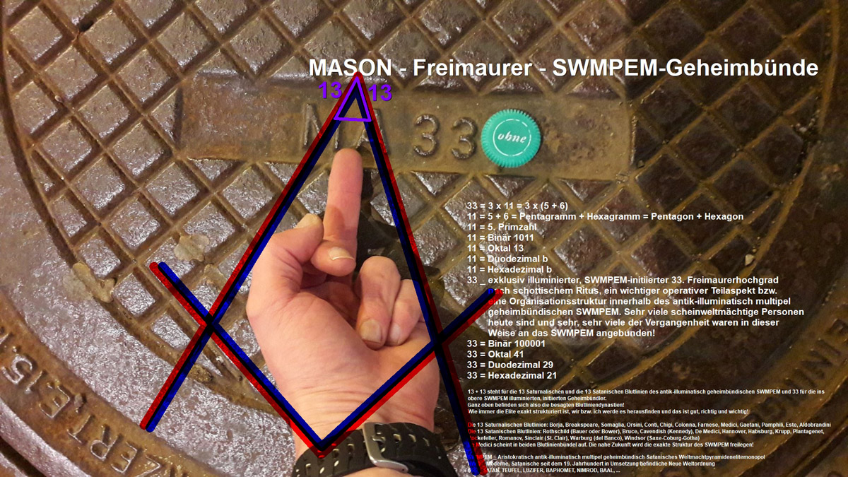Freimaurerei bzw. Freimaurer steht auch als Synonym für das vielschichtige Geheimbündegeflecht des Elite-Netzwerks, die Jesuiten, die Sabbatanischen Frankisten undundund Freemason (Englisch)= Mason (Englisch_verkürzt) = Freimaurer (Deutsch) = SWMPEM-Geheimbündler Freemasonry (Englisch)= Masonry (Englisch_verkürzt) = Freimaurerei (Deutsch) = SWMPEM-Geheimbündelei Für die häufig auftauchenden Zahlen 71, 300 und der Vielfachen davon gilt unter anderem: 71 = 20. Primzahl = 1776 - 1717 + 12 = 1775 - 1717 + 13 = -33 + 137 - 33 = 32 + 23 + 8 + 8 = 53 + 18 = 55 + 16 = 55 + 8 + 8 = 88 - 17 = 54 + 17 = 48 + 23 = Oktal 107 = Duodezimal 5b = Hexadezimal 47 20 = 9+11 = IX+XI ---> 911 = IXXI _ 20: Das 20-Rothschild-Kinder-Konstrukt = 5+5+10 = 5♂+5♀+10 jung-† 300 = 2 x 2 x 3 x 5 x 5 = 24. Dreieckszahl = Oktal 454 = Duodezimal 210 = Hexadezimal 12c ---> K_O_M_I_T_E_E___D_E_R___300 = K_O_M_I_T_E_E___D_E_R___D_R_E_I_H_U_N_D_E_R_T Gematria "Burgenland Kaernten Niederoesterreich Oberoesterreich Salzburg Steiermark Tirol Vorarlberg Wien" Full Reduction = 450 = "ILLUMINATI" + 402 = "Rothschild" + 397 = "Rockefeller" + 394 = "Adolf Hitler" + 394 Single Reduction = 486 = "ILLUMINATI" + 438 = "Rothschild" + 424 = "Rockefeller" + 430 = "Adolf Hitler" + 430 = I__L__L__U__M__I__N__A__T__I + Oktal 666 English Ordinal = 999 = "ILLUMINATI" + 879 = "Rothschild" + 883 = "Rockefeller" + 889 = "Adolf Hitler" + 889 = R__O__C__K__E__F__E__L__L__E__R + 888 + 1 = R__O__C__K__E__F__E__L__L__E__R + 888 + "ONE" 999 = A__D__O__L__F_____H__I__T__L__E__R + 888 + 1 =A__D__O__L__F_____H__I__T__L__E__R + 888 + "ONE" Sumerian = 5994 = "ILLUMINATI" + 5274 = "Rothschild" + 5298 = "Rockefeller" + 5334 = "Adolf Hitler" + 5334 = R__O__T__H__S__C__H__I__L__D + 5280 Braunau am Inn + 18 = R__O__T__H__S__C__H__I__L__D + 5280 Braunau am Inn + 6 + 6 + 6 5994 = 666 + 666 + 666 + 666 + 666 + 666 + 666 + 666 + 666 ---> Im Durchschnitt exakt 666 pro Bundesland 5994 = 222 + 333 + 444 + 555 + 666 + 777 + 888 + 999 + 1110 5994 = 222 + 333 + 444 + 555 + 777 + 888 + 999 + 1776 5994 = 3 x 1776 + 666 = 1776 + 1776 + 1776 + 666 5994 = 888 + 888 + 888 + SIX HUNDRED THREESCORE AND SIX + 888 + 888 + 888 5994 = 5280 Braunau am Inn + 666 + 48 = 5280 Braunau am Inn + 666 + Reduction "ILLUMINATI" 5994 = 10 x 777 - 1776 = Neue Weltordnung x 777 - 1776 5994 = Neue Weltordnung x 777 - 1775 - "ONE" 5994 = Neue Weltordnung x 777 - 1666 - 110 10 = Neue Weltordnung = New World Order = NWO 18 ---> unter vielem anderen satanisch krank SWMPEM-NWO-Schwarze Sonne-okkultistisch Gematria-AH oder "Adolf Hitler" 18 = 2 x 3² = 3 x 6 = 6 + 6 + 6 = 9 + 9 = 3. Heptagonalzahl = Oktal 22 = Duodezimal 16 = Hexadezimal 12 Reverse Sumerian = 8100 = "ILLUMINATI" + 7200 = "Rothschild" + 7176 = "Rockefeller" + 6978 = "Adolf Hitler" + 6978 English Extended = 6048 = "ILLUMINATI" + 5370 = "Rothschild" + 5536 = "Rockefeller" + 5704 = "Adolf Hitler" + 5605 Reverse Ordinal = 1350 = "ILLUMINATI" + 1200 = "Rothschild" + 1196 = "Rockefeller" + 1163 = "Adolf Hitler" + 1163 Jewish Reduced = 446 = "ILLUMINATI" + 404 = "Rothschild" + 389 = "Rockefeller" + 396 = "Adolf Hitler" + 395 Jewish Ordinal = 959 = "ILLUMINATI" + 845 = "Rothschild" + 848 = "Rockefeller" + 855 = "Adolf Hitler" + 854 Jewish = 5378 = "ILLUMINATI" + 4940 = "Rothschild" + 5006 = "Rockefeller" + 5094 = "Adolf Hitler" + 5075 ALW Kabbalah = 1243 = "ILLUMINATI" + 1093 = "Rothschild" + 1143 = "Rockefeller" + 1093 = "Adolf Hitler" + 1119 KFW Kabbalah = 1211 = "ILLUMINATI" + 1037 = "Rothschild" + 1079 = "Rockefeller" + 1085 = "Adolf Hitler" + 1079 LCH Kabbalah = 1069 = "ILLUMINATI" + 983 = "Rothschild" + 989 = "Rockefeller" + 959 = "Adolf Hitler" + 978 Septenary = 357 = "ILLUMINATI" + 322 = "Rothschild" + 311 = "Rockefeller" + 314 = "Adolf Hitler" + 312 322 = The Order = Skull and Bones = Skull & Bones = Order 322 = The Brotherhood of Death 322 ist auch die Zahl von SWMPEM-Skull & Bones in Yale (USA): Skull & Bones (engl. "Schädel und Knochen") ist eine Studentenverbindung der Yale University. Sie wurde 1832 gegründet und wird von der Russell Trust Association finanziert, die als Ehemaligenorganisation 1856 in die Universität eingegliedert wurde. 322 = 14 x 23 = (7 + 7) x (13 + 10) = 7 x 46 = 7 x (13 + 33) = 7 x (30 + 16) = 7 x (30 + 8 + 8) = 7 x (24 + 22) = 7 x (32 + 7 + 7) = 7 x (20 + 13 + 13) = (7 + 7) x (14 + 9) = 300 + 22 = Binär 101000010 = Oktal 502 = Duodezimal 22a = Hexadezimal 142 Satanic = 4044 = "ILLUMINATI" + 3574 = "Rothschild" + 3578 = "Rockefeller" + 3549 = "Adolf Hitler" + 3549 Franc Baconis = 1989 = "ILLUMINATI" + 1759 = "Rothschild" + 1758 = "Rockefeller" + 1770 = "Adolf Hitler" + 1771 Primes = 3140 = "ILLUMINATI" + 2767 = "Rothschild" + 2784 = "Rockefeller" + 2815 = "Adolf Hitler" + 2812 Trigonal = 8197 = "ILLUMINATI" + 7268 = "Rothschild" + 7295 = "Rockefeller" + 7441 = "Adolf Hitler" + 7412 Squares = 15395 = "ILLUMINATI" + 13657 = "Rothschild" + 13707 = "Rockefeller" + 13993 = "Adolf Hitler" + 13935 Full Reduction = 450 = 498 - "ILLUMINATI" = 503 - "Rothschild" = 506 - "Rockefeller" = 506 - "Adolf Hitler" Single Reduction = 486 = 534 - "ILLUMINATI" = 548 - "Rothschild" = 542 - "Rockefeller" = 542 - "Adolf Hitler" English Ordinal = 999 = 1119 - "ILLUMINATI" = 1115 - "Rothschild" = 1109 - "Rockefeller" = 1109 - "Adolf Hitler" Sumerian = 5994 = 6714 - "ILLUMINATI" = 6690 - "Rothschild" = 6654 - "Rockefeller" = 6654 - "Adolf Hitler" Reverse Sumerian = 8100 = 9000 - "ILLUMINATI" = 9024 - "Rothschild" = 9222 - "Rockefeller" = 9222 - "Adolf Hitler" = 30 x 300 - I__L__L__U__M__I__N__A__T__I English Extended = 6048 = 6726 - "ILLUMINATI" = 6560 - "Rothschild" = 6392 - "Rockefeller" = 6491 - "Adolf Hitler" Reverse Ordinal = 1350 = 1500 - "ILLUMINATI" = 1504 - "Rothschild" = 1537 - "Rockefeller" = 1537 - "Adolf Hitler" = 5 x 300 - I__L__L__U__M__I__N__A__T__I 1500 = 5 x 300 = symbolisch (Rothschild_Frankfurt + Rothschild_Wien + Rothschild_London + Rothschild_Paris + Rothschild_Neapel) x K_O_M_I_T_E_E___D_E_R___300 J